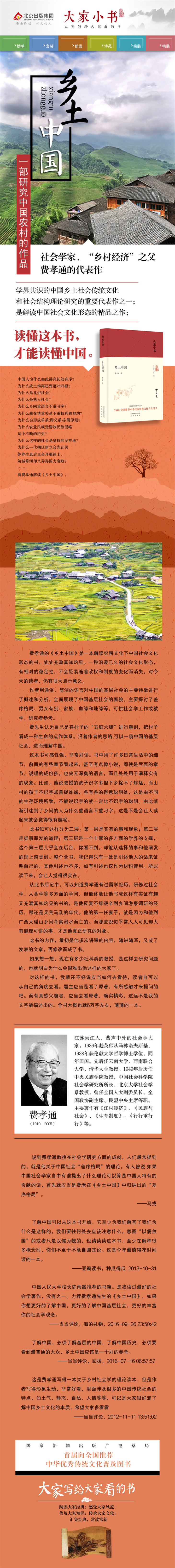 《大家小书:乡土中国》是社会学大师费孝通的代表作,该书取自作者20世纪40年代后期在西南联大和云南大学所讲的“乡村社会学”一课的内容,而应当时《世纪评论之约》分期连载的14篇文章。通览全书,可以感受到一股浓浓的乡土气息。沿着作者的思路,可以一窥中国的基层社会。虽然事过境迁,但作者透视社会的眼光、观察社会的方法,仍然充满活力,值得借鉴。