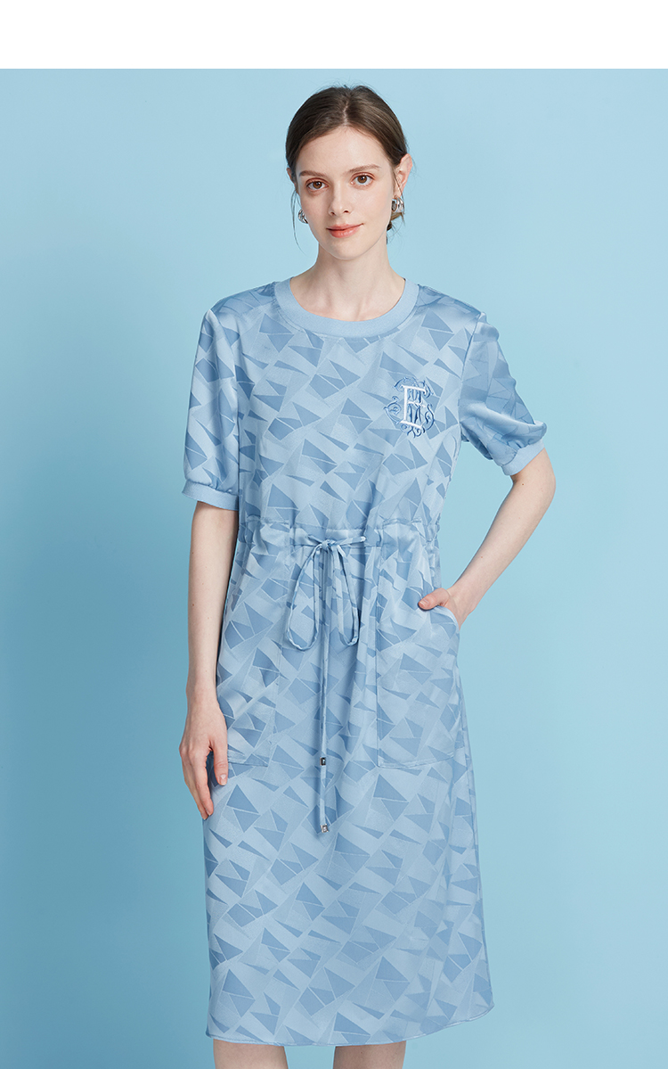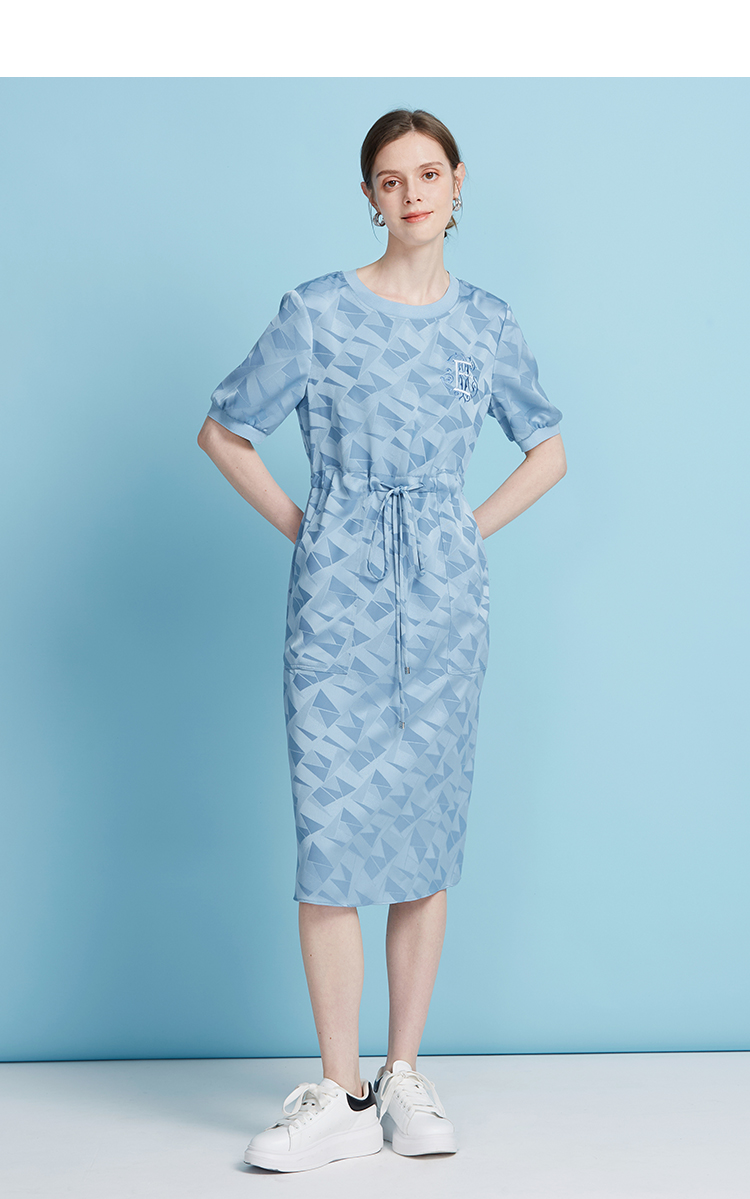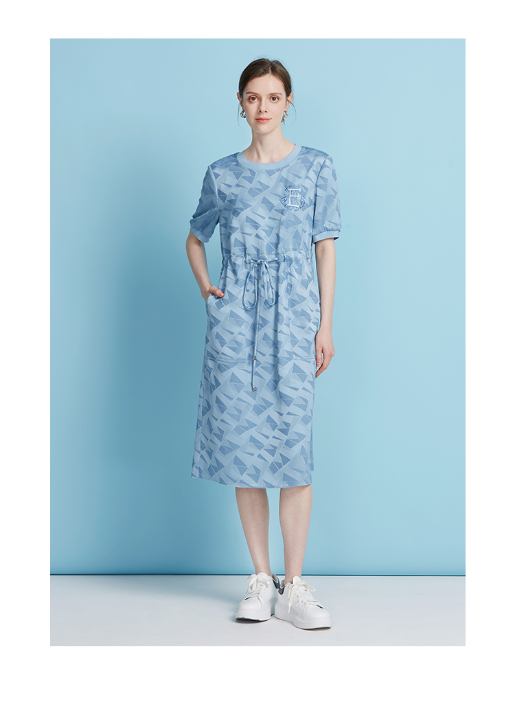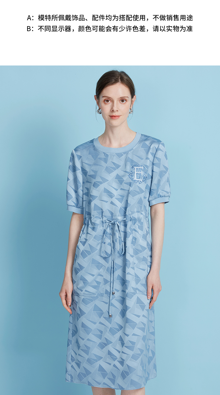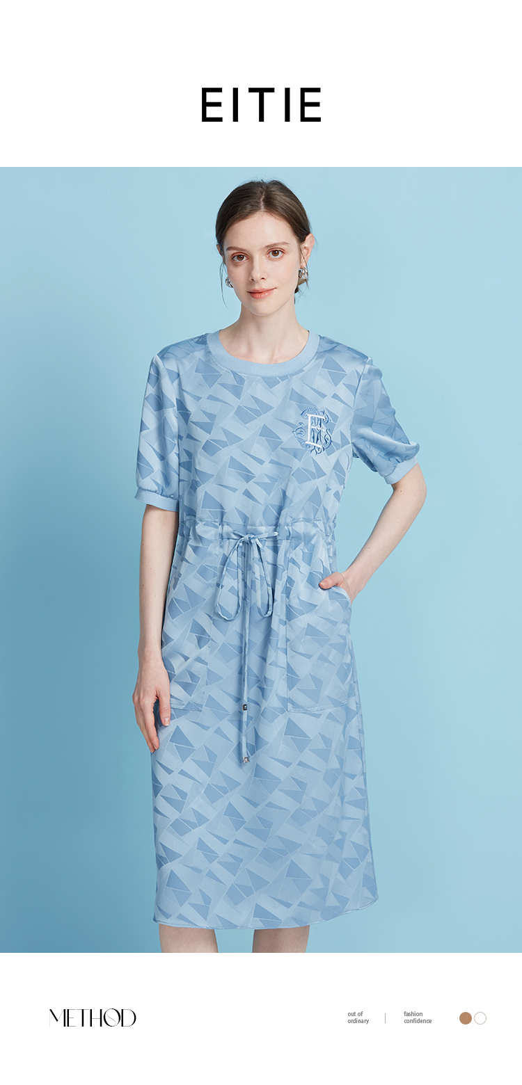 EITIE爱特爱休闲轻运动直筒收腰圆领蓝色短袖连衣裙夏季新款B2507688