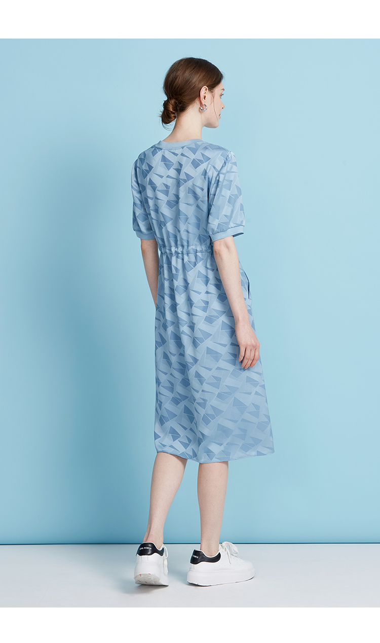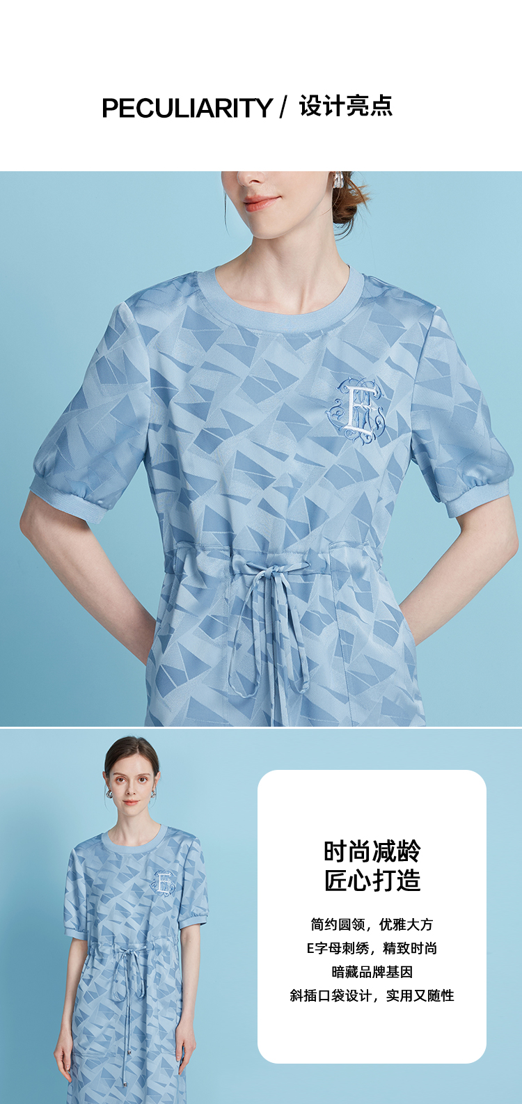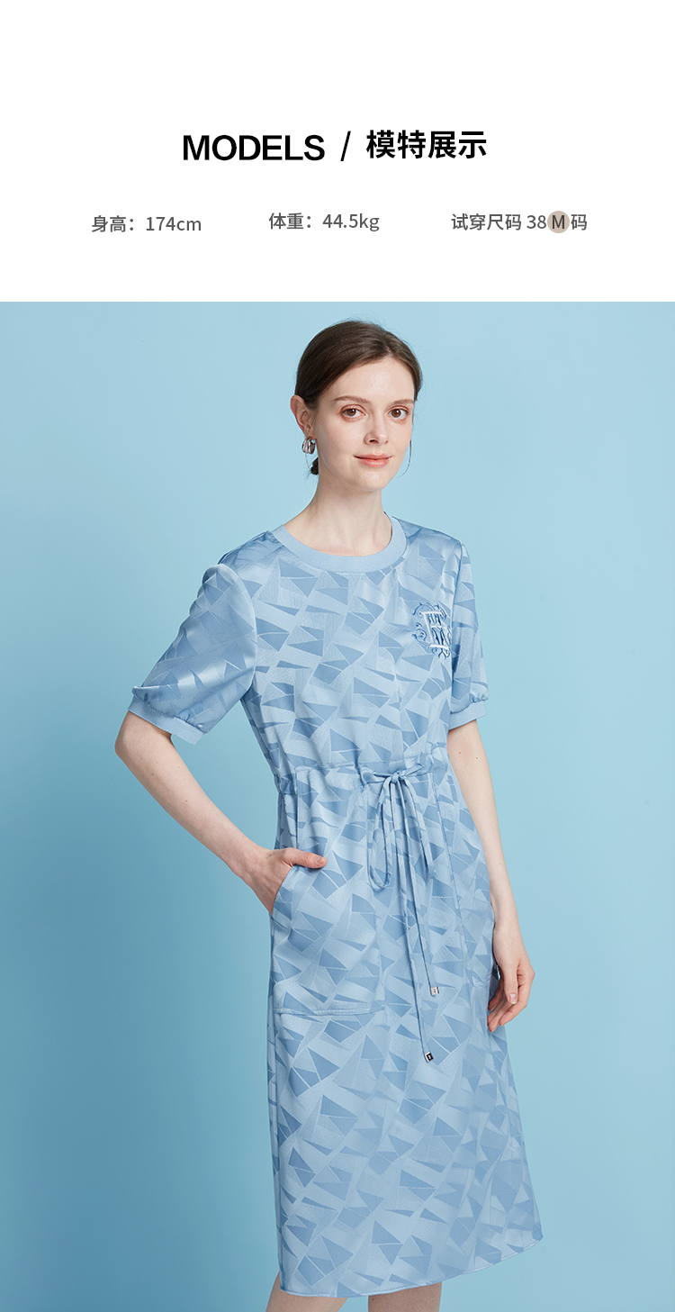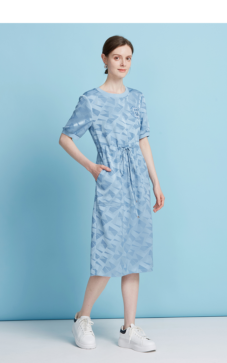 EITIE爱特爱休闲轻运动直筒收腰圆领蓝色短袖连衣裙夏季新款B2507688