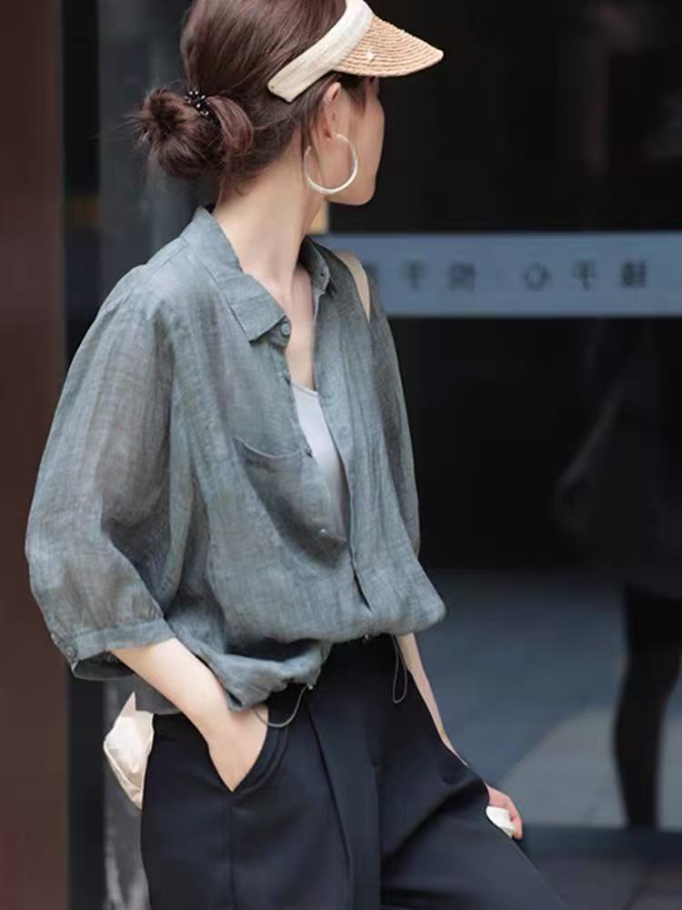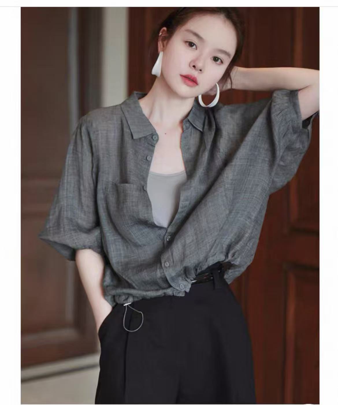 【新品推荐】灰色翻领亚麻空调扇防晒衫小衫-喜出