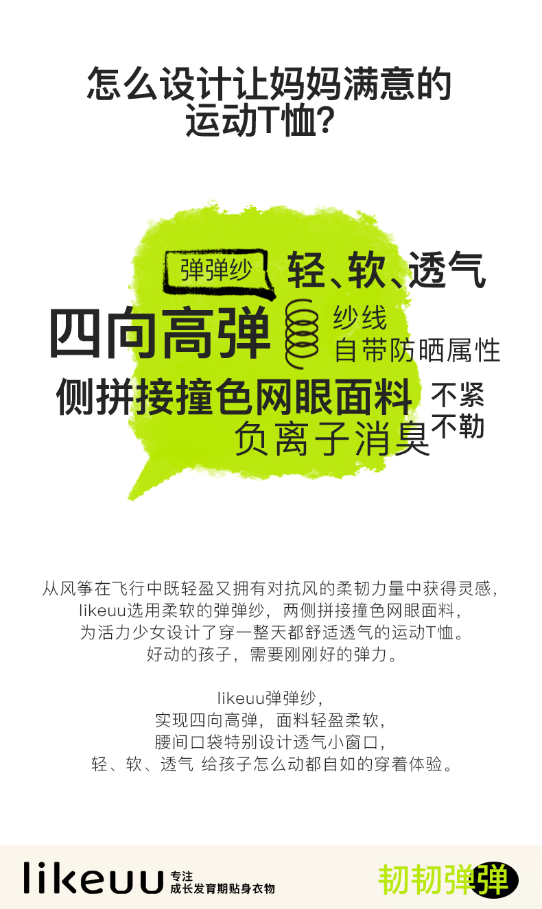 - likeuu是专注于为6~15岁的青少年创造柔软、无束缚的成长体验,以好奇心为灵感的成长发育期贴身衣物品牌。likeuu的产品覆盖内衣、内裤、保暖衣、家居服、运动等品类。