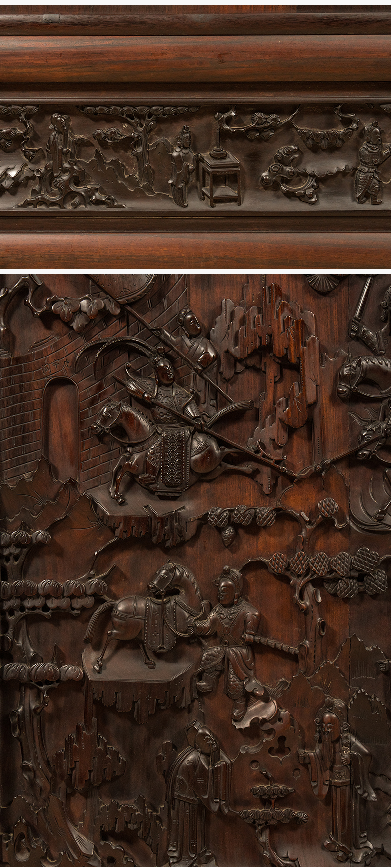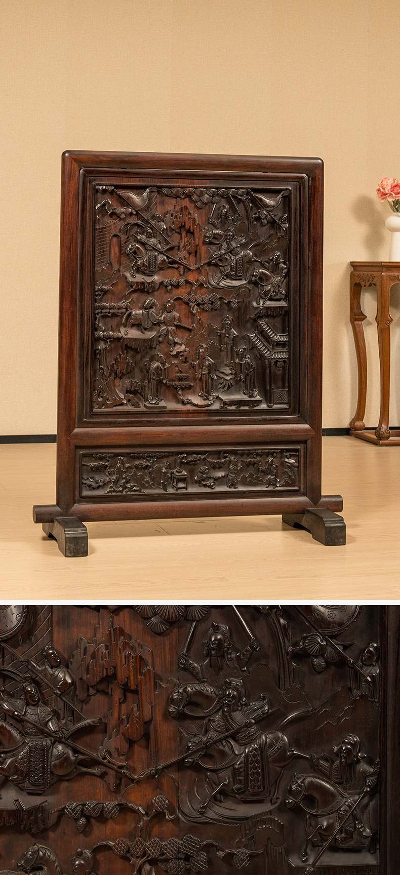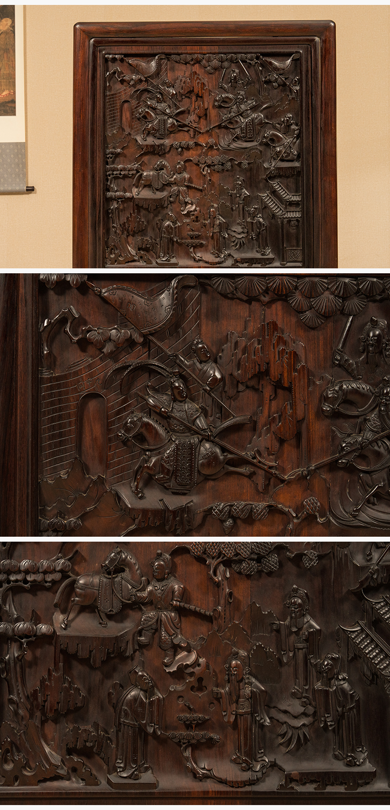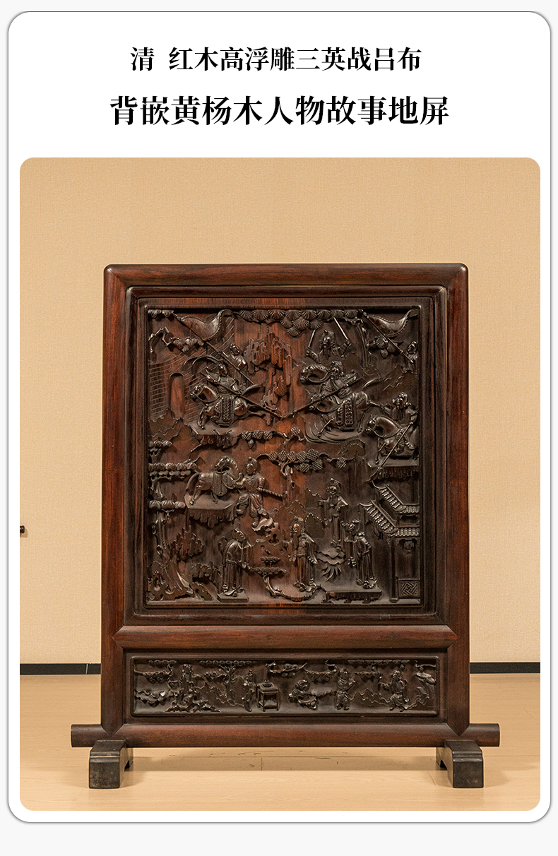 清 红木高浮雕三英战吕布背嵌黄杨木人物故事地屏