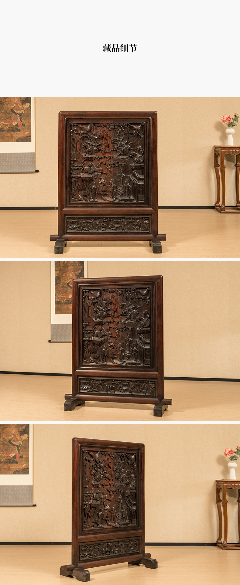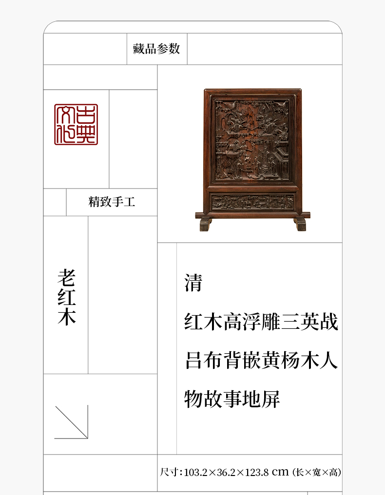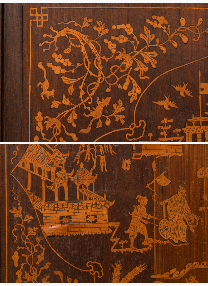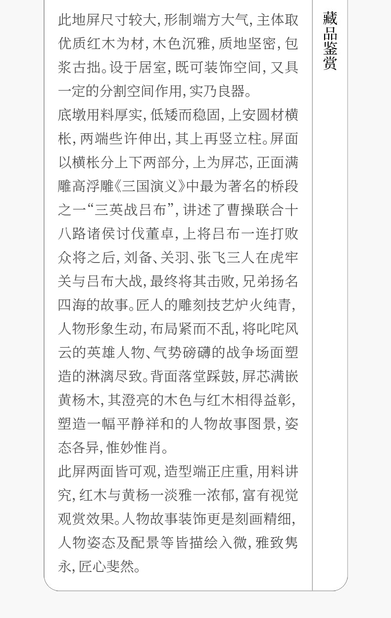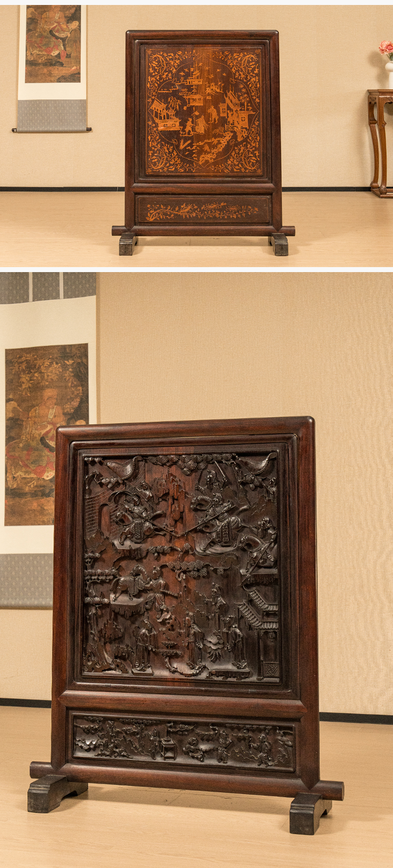 清 红木高浮雕三英战吕布背嵌黄杨木人物故事地屏