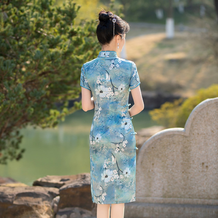印花丝绸旗袍年轻款优雅复古气质古法蓝色连衣裙XS118