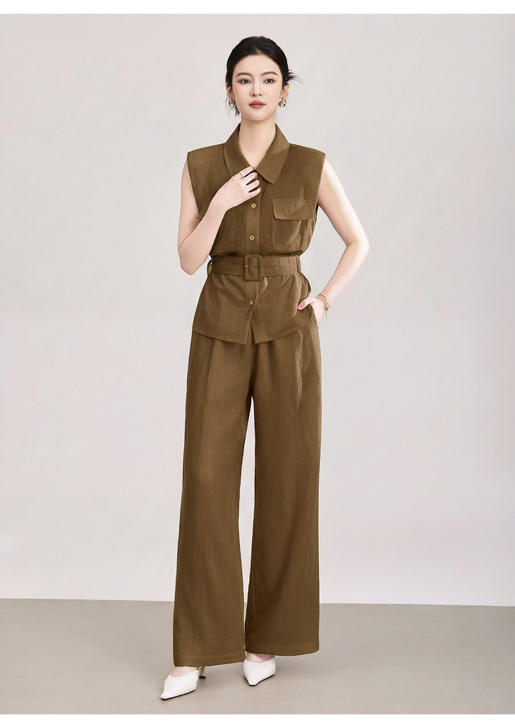 天丝亚麻老钱风腰带无袖衬衫 高腰阔腿裤套装 WLZD2603301