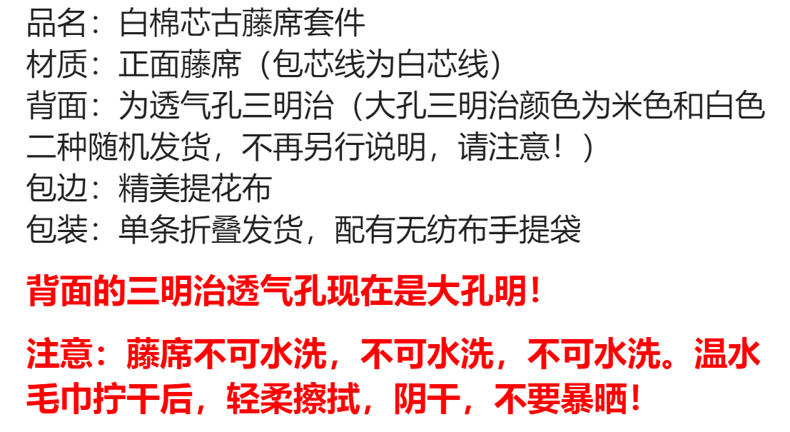 2、收藏前,须将席面擦拭干净,置于透风处晾干,收入包装内,放置于干燥避光处。 3、本产品不可以水洗,不可以曝晒,不可以用尖锐切割,不可以存放在潮湿处