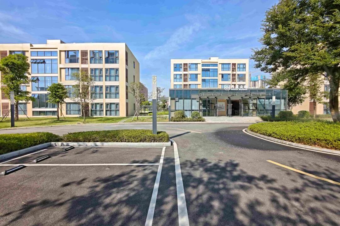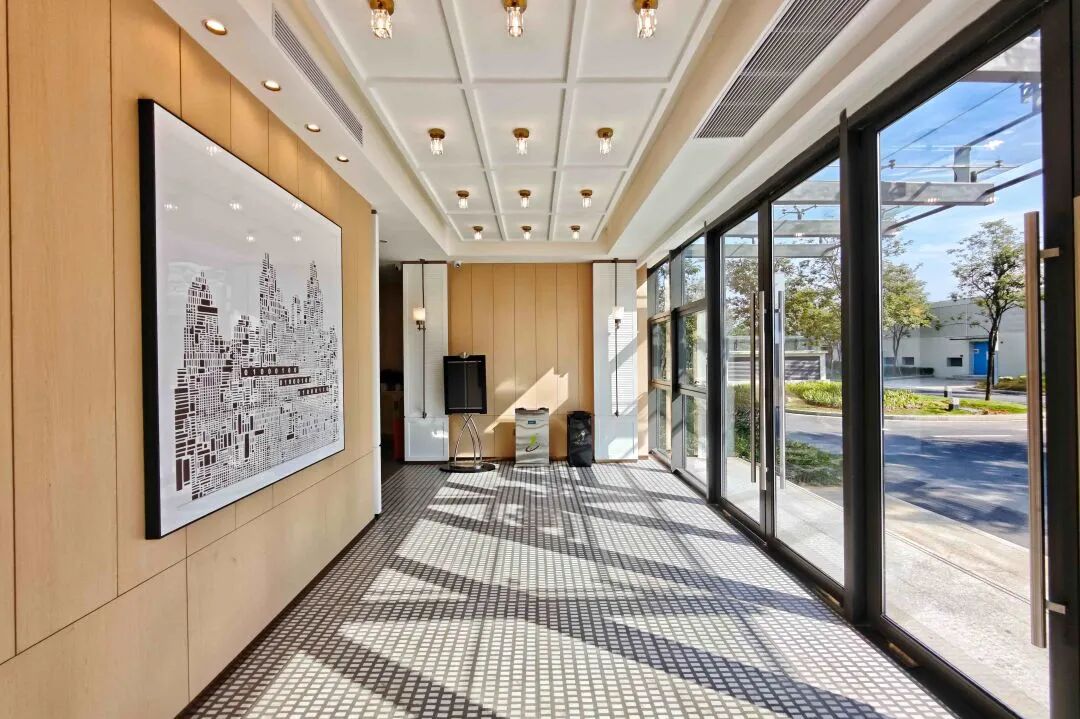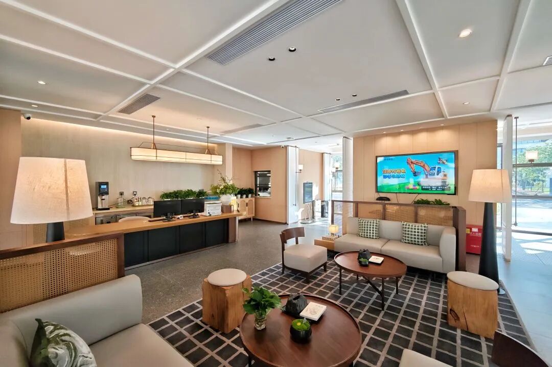 酒店建筑采用现代风格,外观简洁大气,玻璃幕墙设计使得建筑显得通透明亮。入口处有一个大型的玻璃门廊,方便客人进出,同时也增加了酒店的现代感。