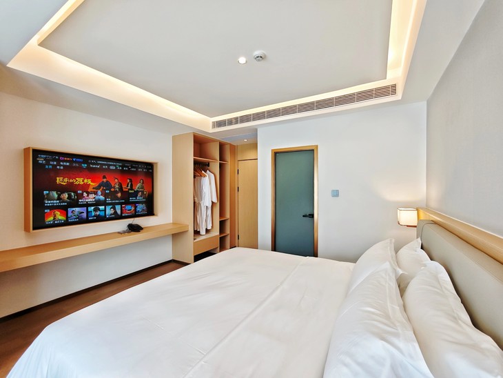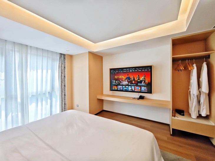 房间设计现代简约,布局合理,空间宽敞,配有大床、书桌和电视,满足不同类型的客人的需求。