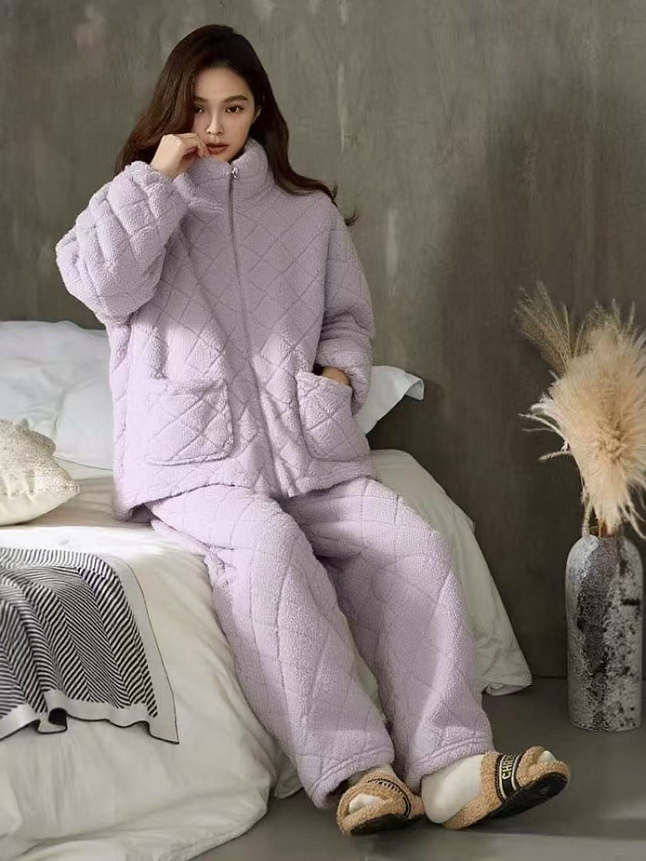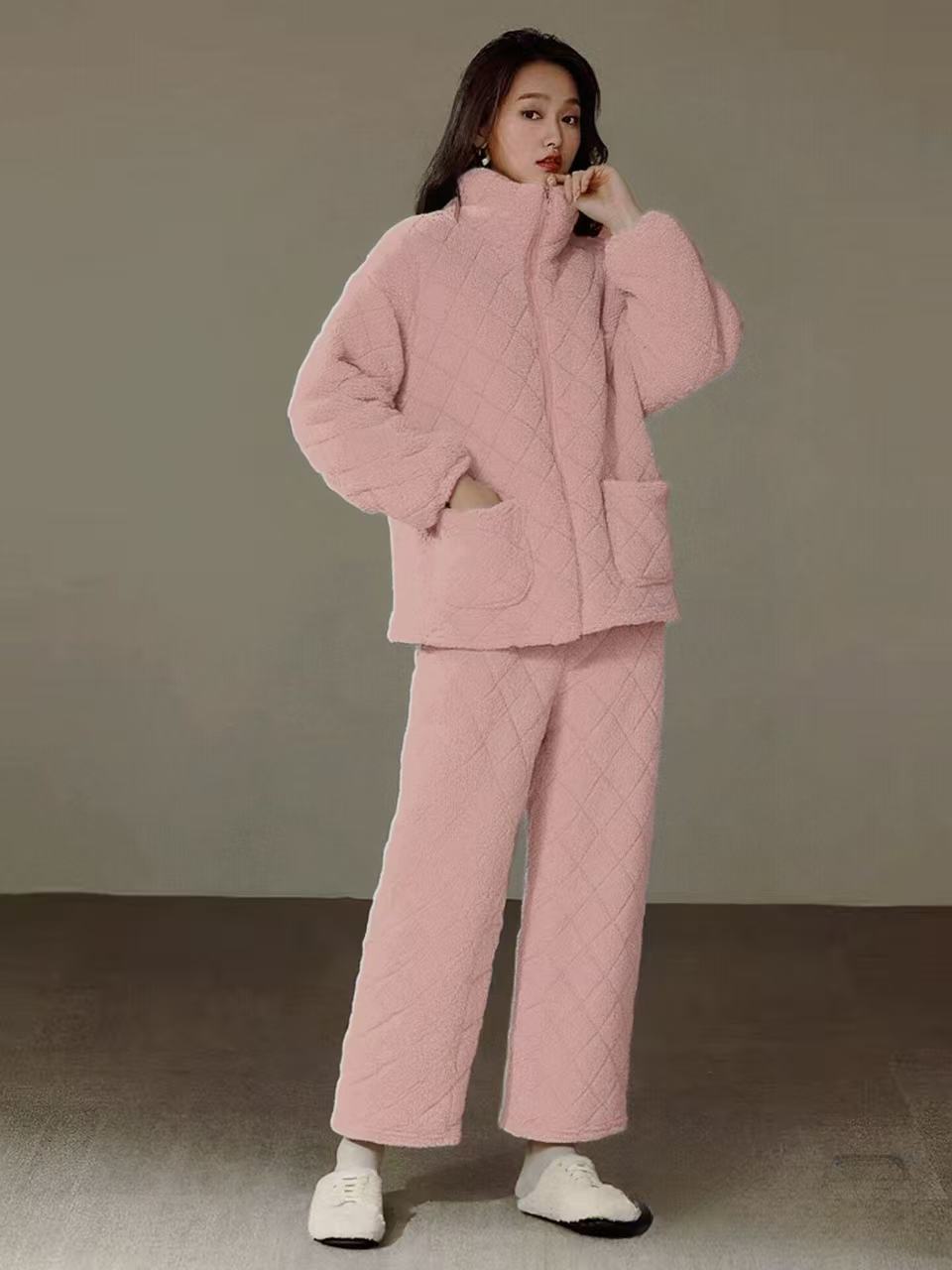 超暖珊瑚绒【套装】冬季内里加绒两件套菱形格套装中厚睡衣-喜出