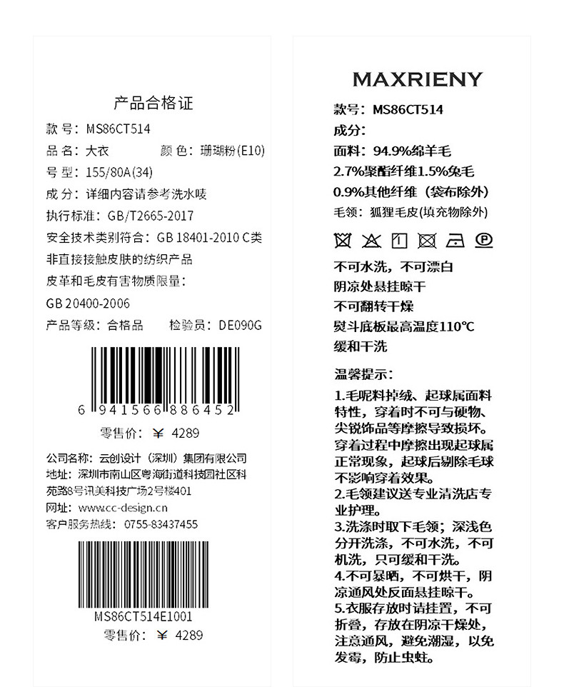 天虹玛克门店发货:MAXRIENY极简风穿搭羊毛大衣(货号:MS86CT514)