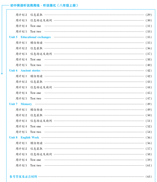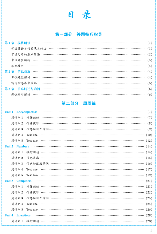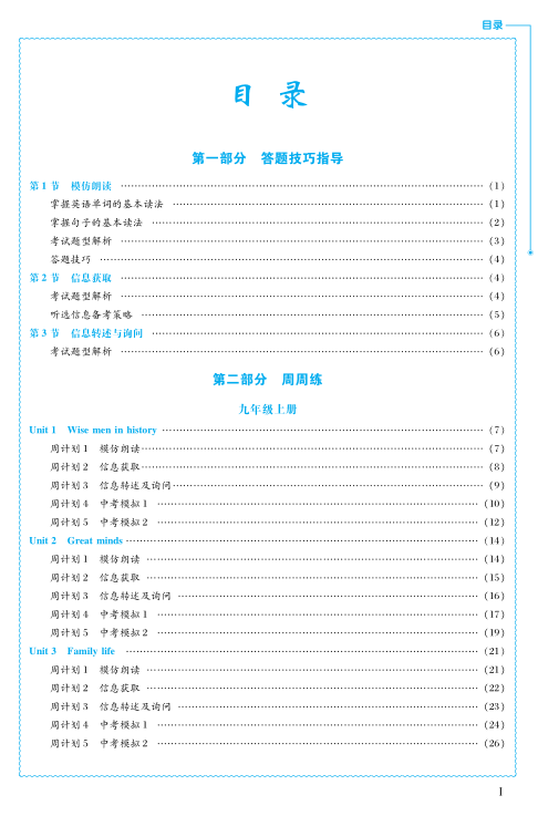 层次性:每个单元按2个学习周设计了5个周计划,由易到难,循序渐进。第一个学习周建议使用周计划1-3的题型练习,第二个学习周建议使用周计划4-5的套题训练。七年级重基础,每单元的周计划中,从单词听说训练到短语听说训练,再到句子和段落听说训练,最后进行中考题型的基础训练;八年级重能力提升,每单元的周计划中,从短语听说训练到句子听说训练再到段落听说训练,最后进行中考题型的强化训练;九年级全面冲刺中考,进行中考听说模拟训练。