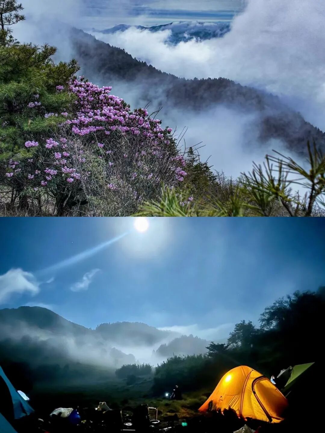 早餐过后,伴随着山林间的晨雾与鸟啼,踏入这片尚未被现代文明大规模侵扰的原始秘境,每迈出一步皆是全新的探索。动身前往云端草甸老君寨进发,这段路相对好走,大多是在高山草甸上前行,途中能够见到羚羊、毛冠鹿、野猪等野生动物的踪迹。日落时分,我们折返回到杜鹃林营地,搭建好的帐篷在暮色中透出暖黄的光,袅袅炊烟缓缓升起,大家围坐在一起分享着途中的见闻,远处的山林渐渐隐没于夜色之中,唯有虫鸣与欢声笑语在营地周围轻轻流淌。(路餐需自行解决)