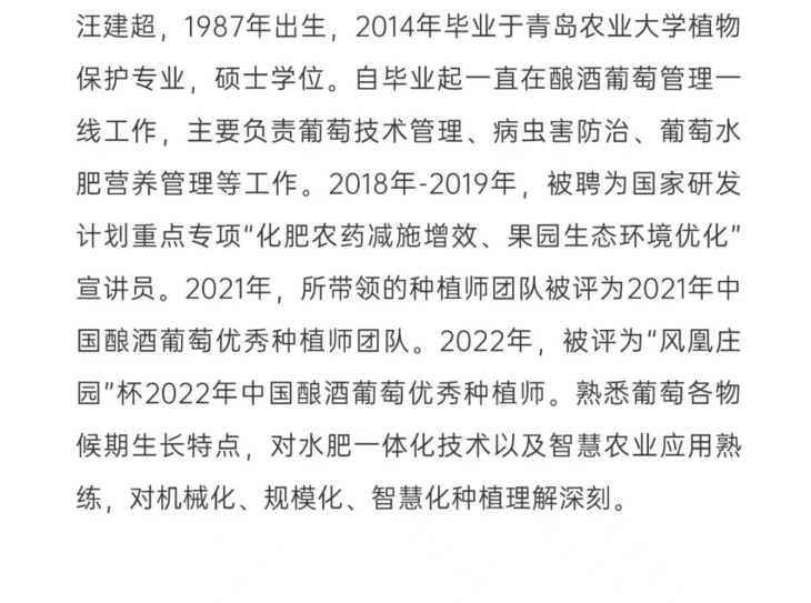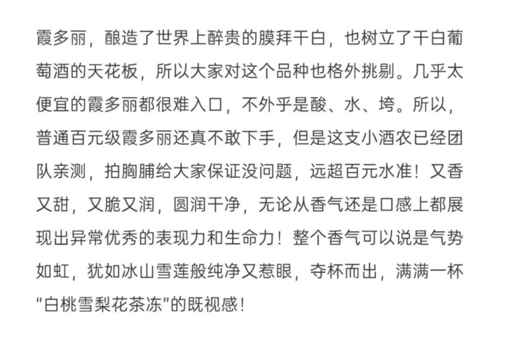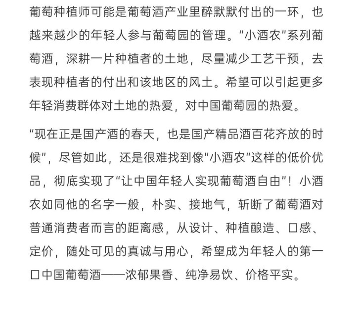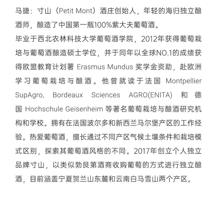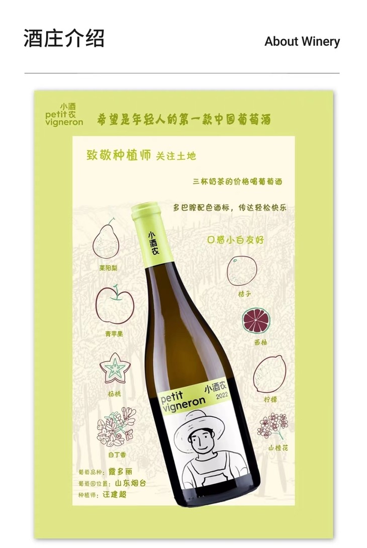 这是独立酿酒人马捷和小酒农汪建超合作的一款山东烟台产区霞多丽干白。颜色上是浅柠檬黄色,澄清透明有光泽,香气纯净,浓郁度中等,有类似柑橘类水果的果香,也有一些青苹果和梨子还有黄桃的香气,也略有烘烤的榛子的和些许黄油的香气,香气整体表现是愉悦的。入口中等偏低的酸度,果味和吐司面包味道在口腔中明显增强,应该来自酒泥接触和苹乳发酵,口腔略有一丝咸鲜的矿物质感,酒体中等,不轻盈也不饱满,无单宁感(无浸皮),表现的干净利落,略显平淡,算是一个标准版本的霞多丽,但如果作为一款口粮酒,是完美的。和小酒农干红一样不错的性价比,推荐!