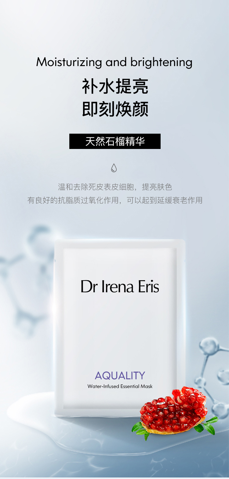 Dr Irena Eris补水精华面膜具有卓越的保湿和促进再生的特性:立即改善皮肤的外观,减少任何疲劳的迹象,恢复面部的活力,并具有舒缓和镇静的效果。必备面膜,含有y-聚谷氨酸(y-PGA),保湿效果是透明质酸的5倍。由于它与皮肤的高度相容性,y-PGA强烈地结合水分子,使面部皮肤的水合水平瞬间显著增加。桃果提取物促进胶原蛋白合成,减少皱纹,改善皮肤弹性。天然石榴精华能温和去除死皮表皮细胞,提亮肤色。面膜由细腻的丝绒般柔软的面料制成,紧贴面部,给疲惫的肌肤带来滋润和放松。