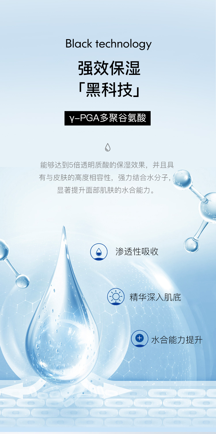 主要的功效就是保湿镇静。里面用的是y-聚谷氨酸(y-PGA),保湿效果是透明质酸的5倍,这才是真正的用一次等于10次补水!