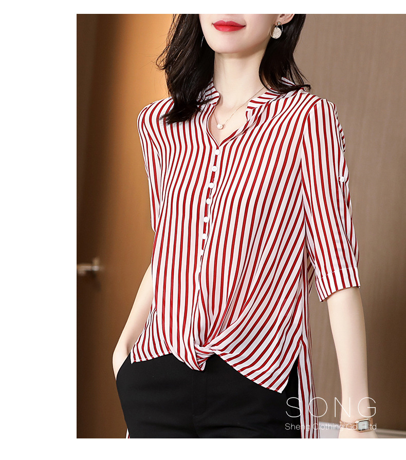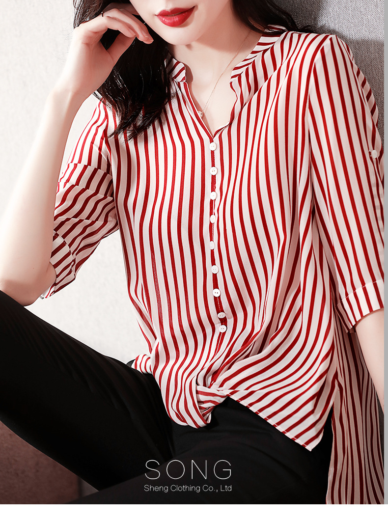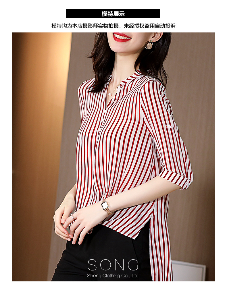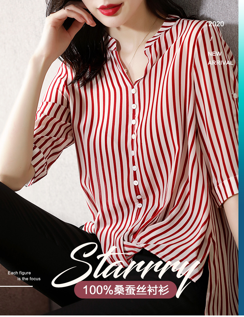 SS-03-2501桑蚕丝衬衣2020条纹真丝中长款v领显瘦短袖上衣衬衫