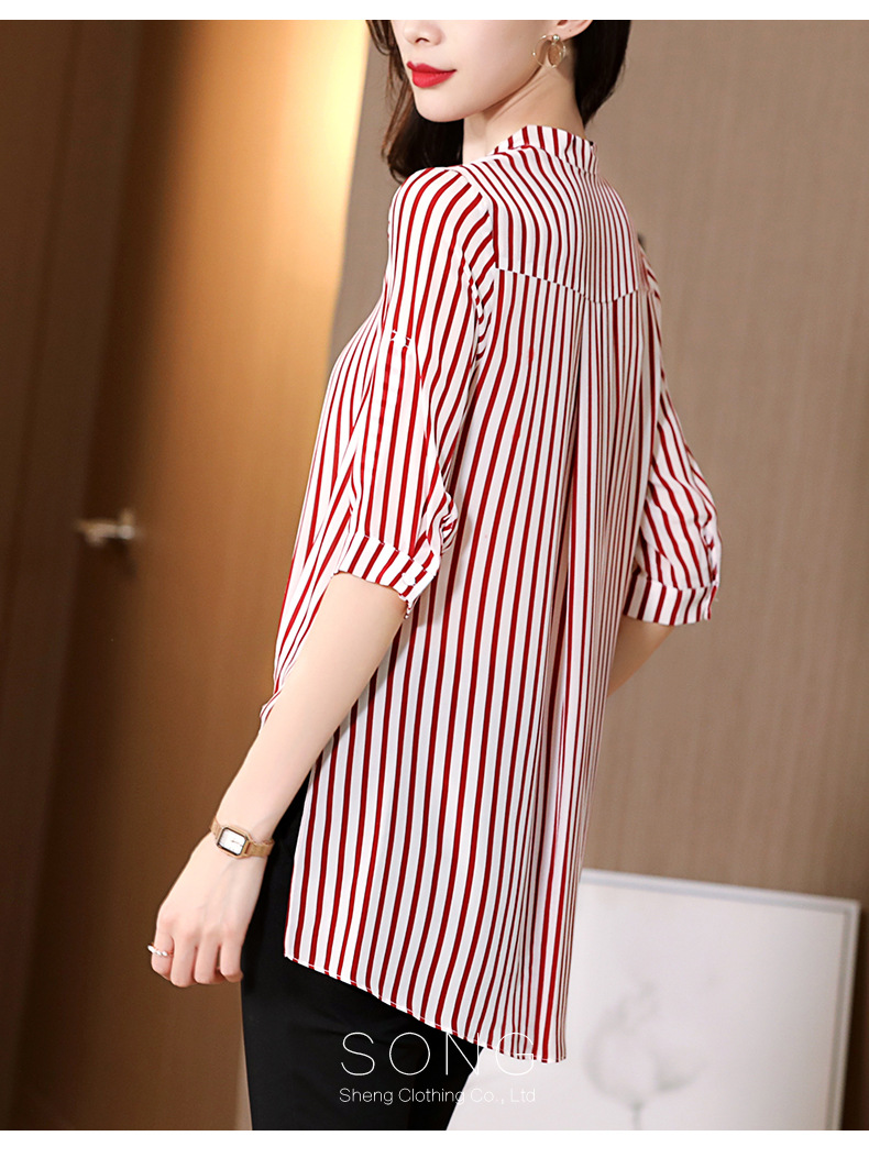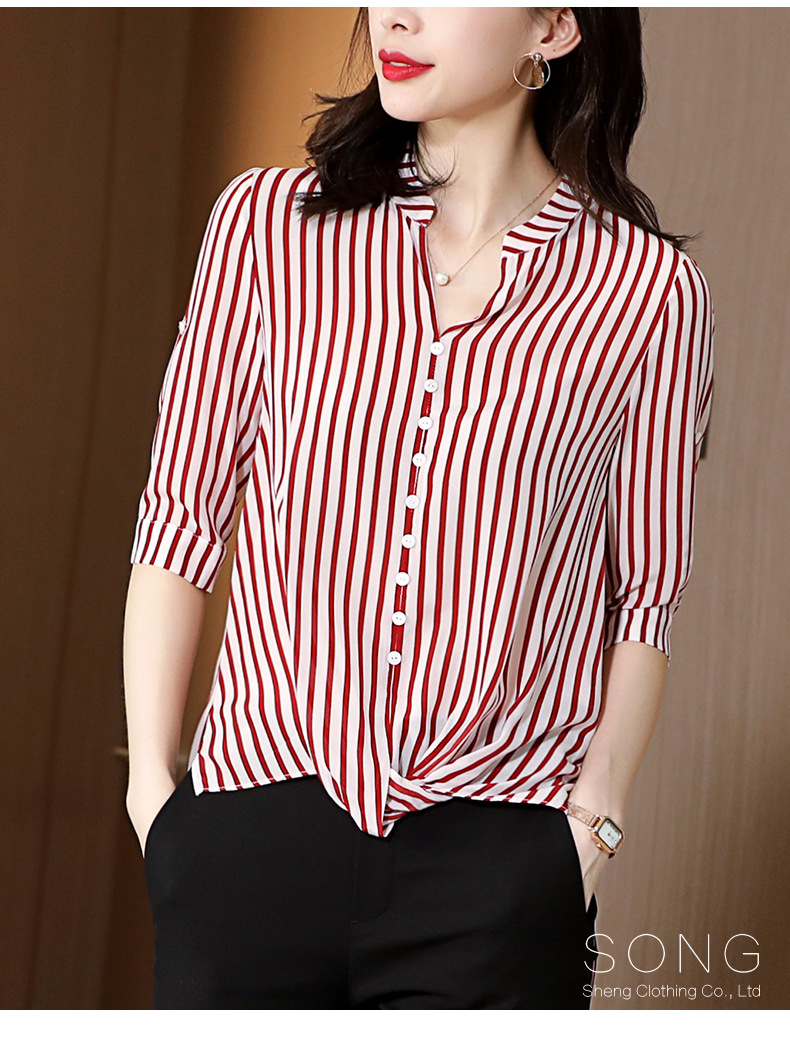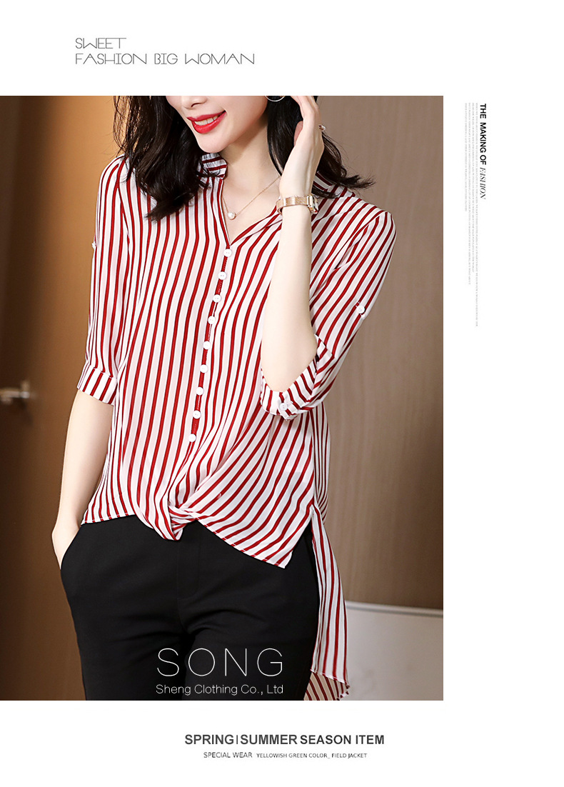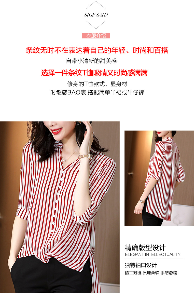 SS-03-2501桑蚕丝衬衣2020条纹真丝中长款v领显瘦短袖上衣衬衫