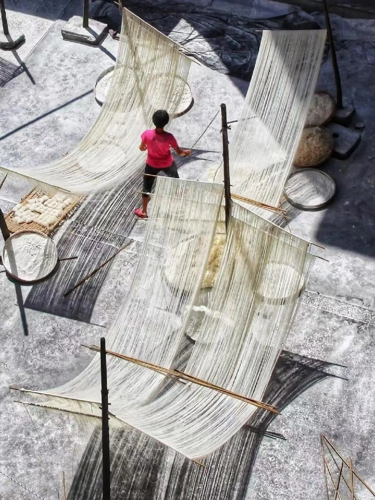 团柔中带韧 拉条时需在竹竿上反复拉伸,将粗条拉成直径不足1毫米、根根不断的细丝 最后还要趁着福建的阳光与微风自然晾晒 让面线吸收天地之气,成就爽滑软糯的口感
