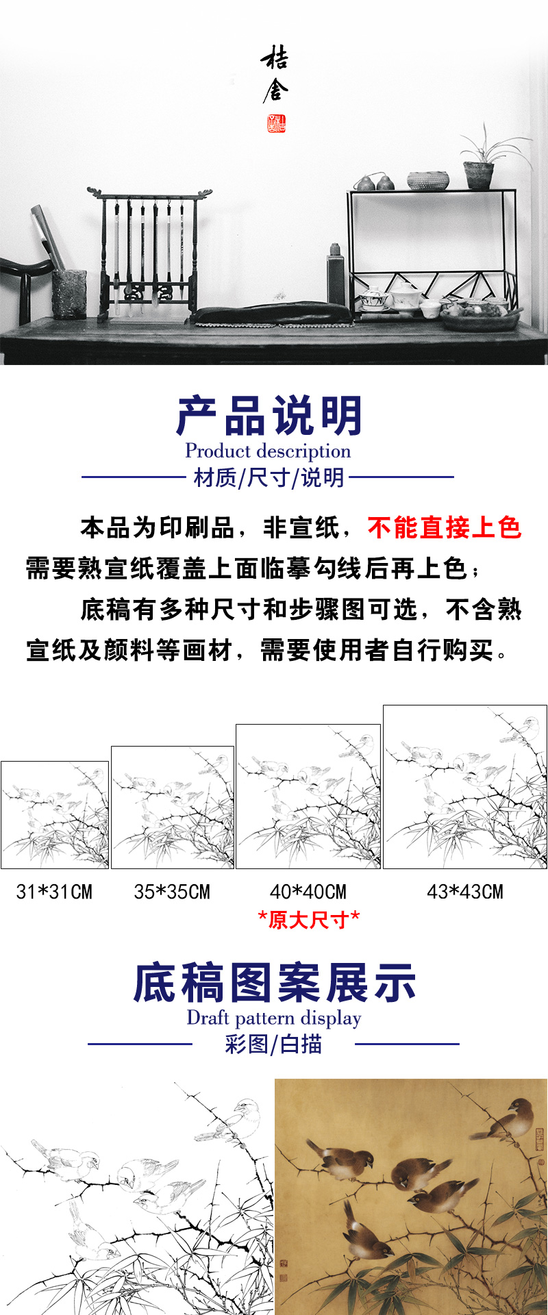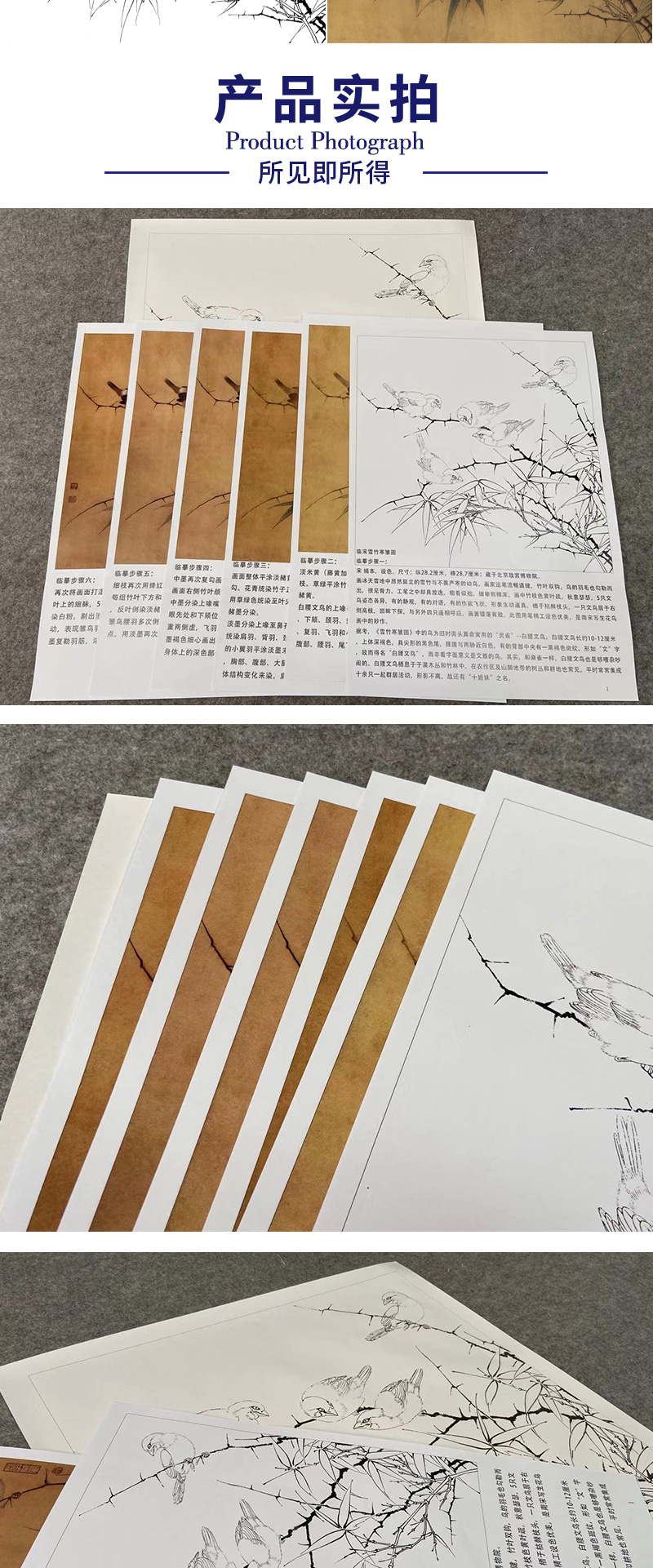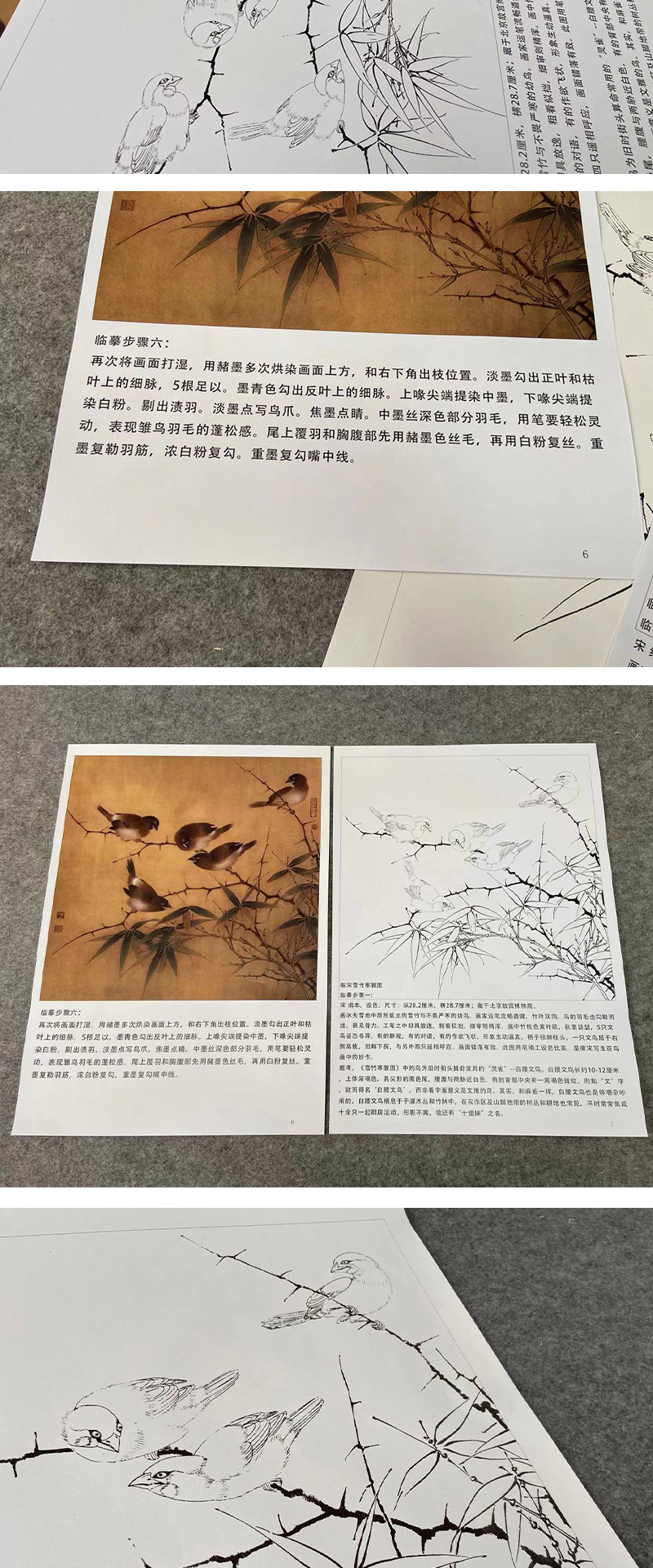 【有步骤、大彩图】李晓明工笔花鸟画白描底稿《临宋雪竹寒雏图》-斗方小品册页-KC14