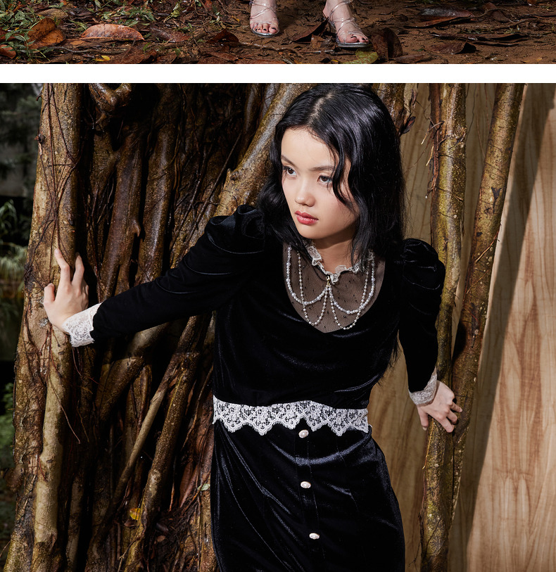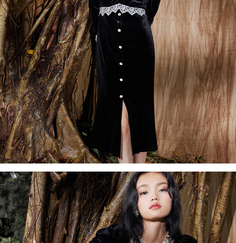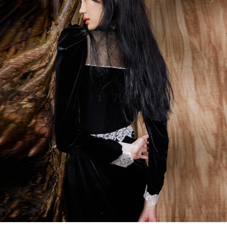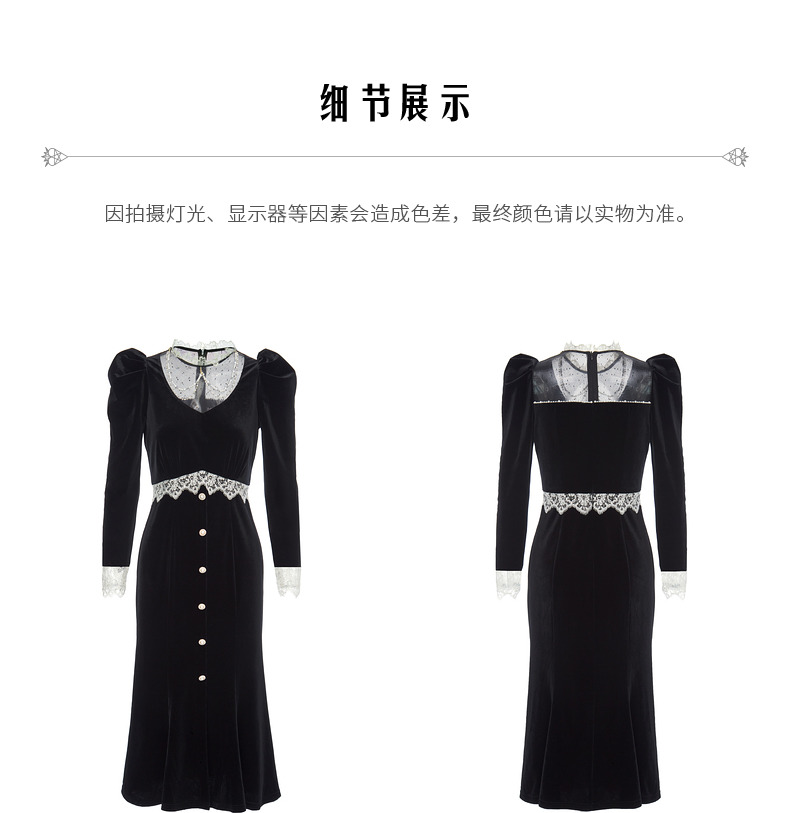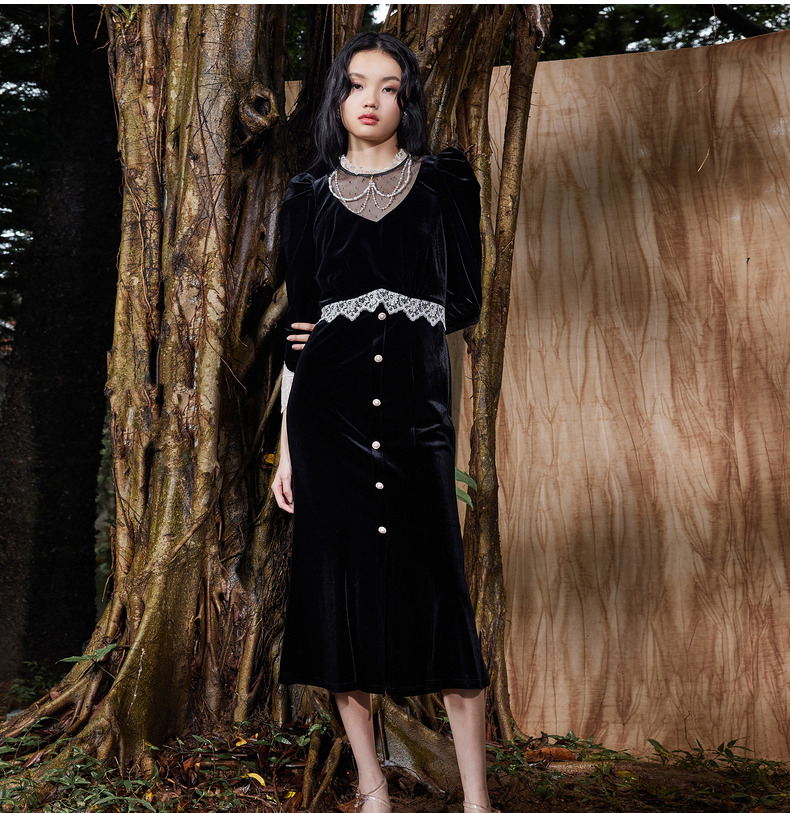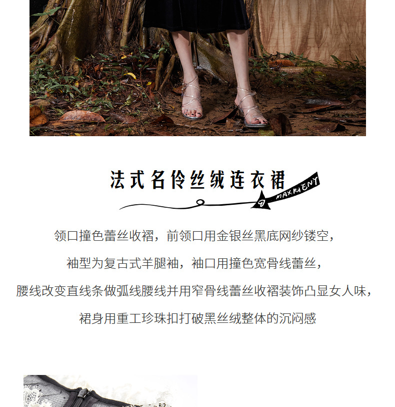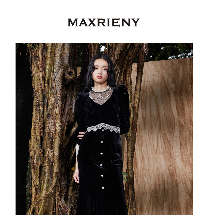 MAXRIENY丝绒连衣裙法式蕾丝裙泡泡袖赫本风长裙(货号:MS87DR514)