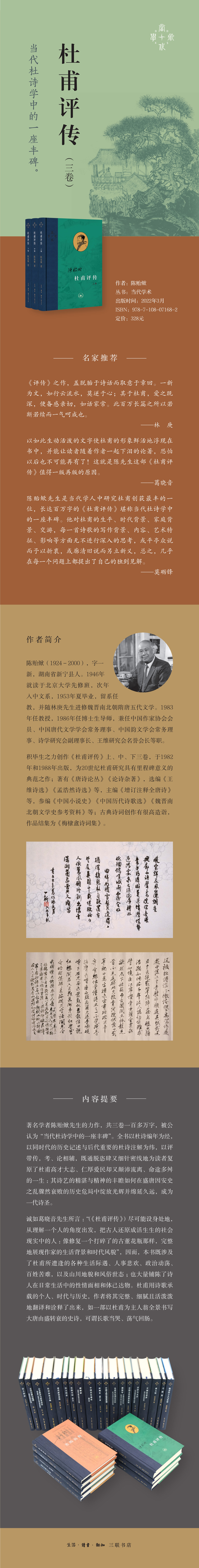 其实在陈先生《杜甫评传》出版后的三十多年里,杜甫研究又经历了两代学者的推进,很多不同类型的相关研究乃至同名著作始终没有断绝,其中也不乏有新的研究高度和研究视角的佳作,更有两部大型的杜诗全注面世,标志着新时期杜诗注释的重要成就。但是在众多的杜诗研究新著中,能够替代陈先生《杜甫评传》的著作却很难找到,因为这部书在全面考订杜甫一生行迹的基础上,细腻深刻地展示出杜甫的心迹和性情,并对大量杜诗的内涵和艺术特点做出了精彩分析,已经成为二十世纪杜甫研究的里程碑,也是当今学者研究杜甫不可或缺的必读参考书。最难得的是,以如此生动活泼的文字使杜甫的形象鲜活地浮现在书中,并能让读者随着作者一起下泪的论著,恐怕以后也不可能再有了!这就是陈先生这部《杜甫评传》值得一版再版的原因。