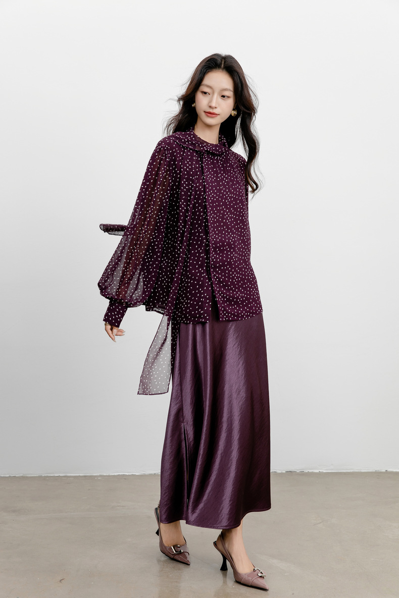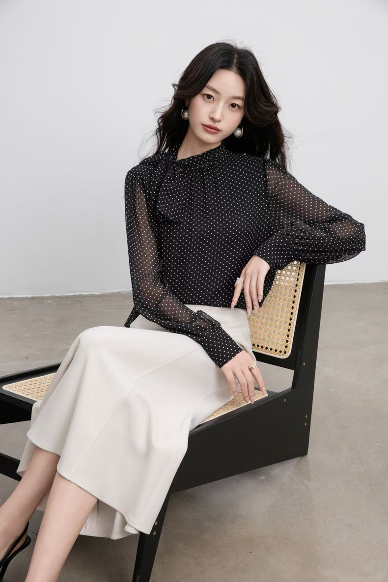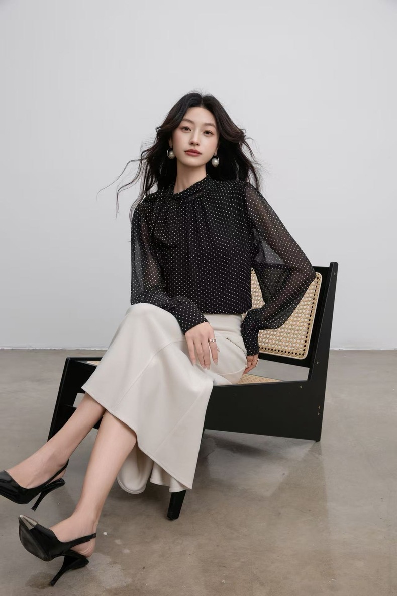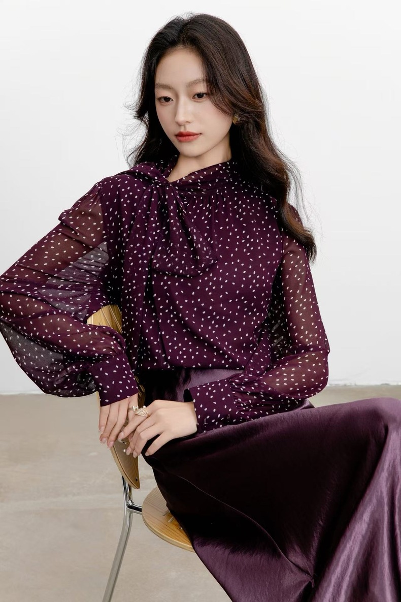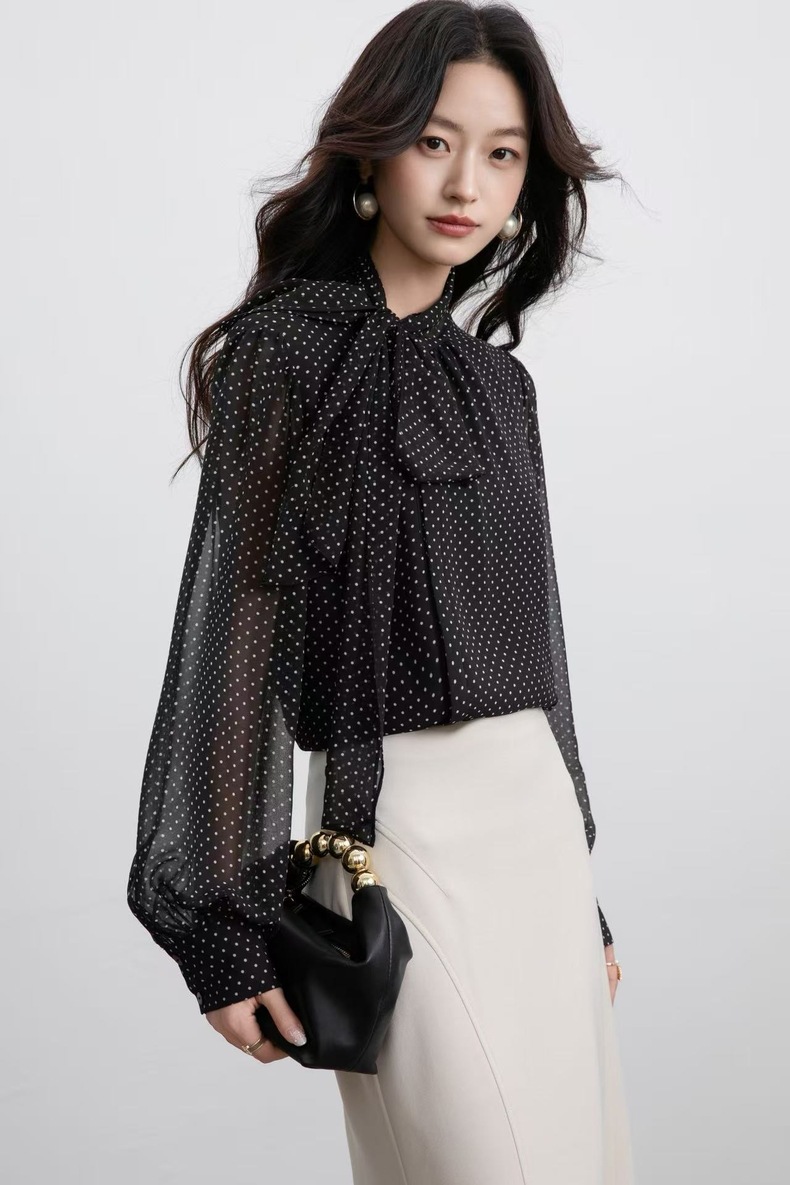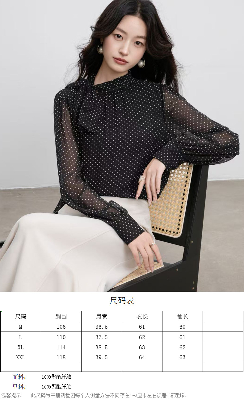 「自」全新升级【铂金会员146/天猫199/差价53】(35008)洛诗琳法式波点长袖衬衫2025秋季通勤百搭系带雪纺上衣女