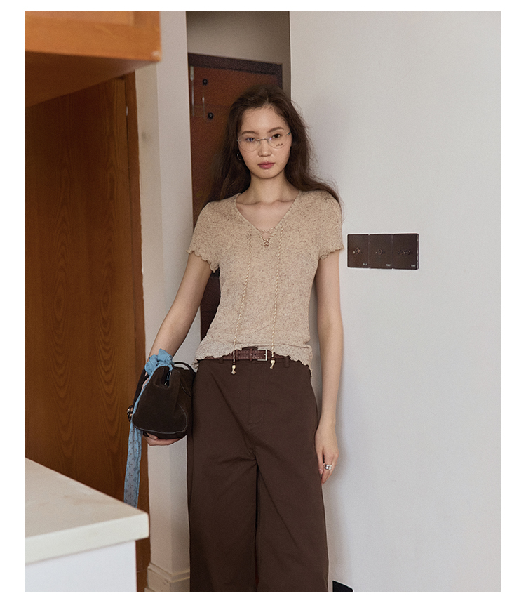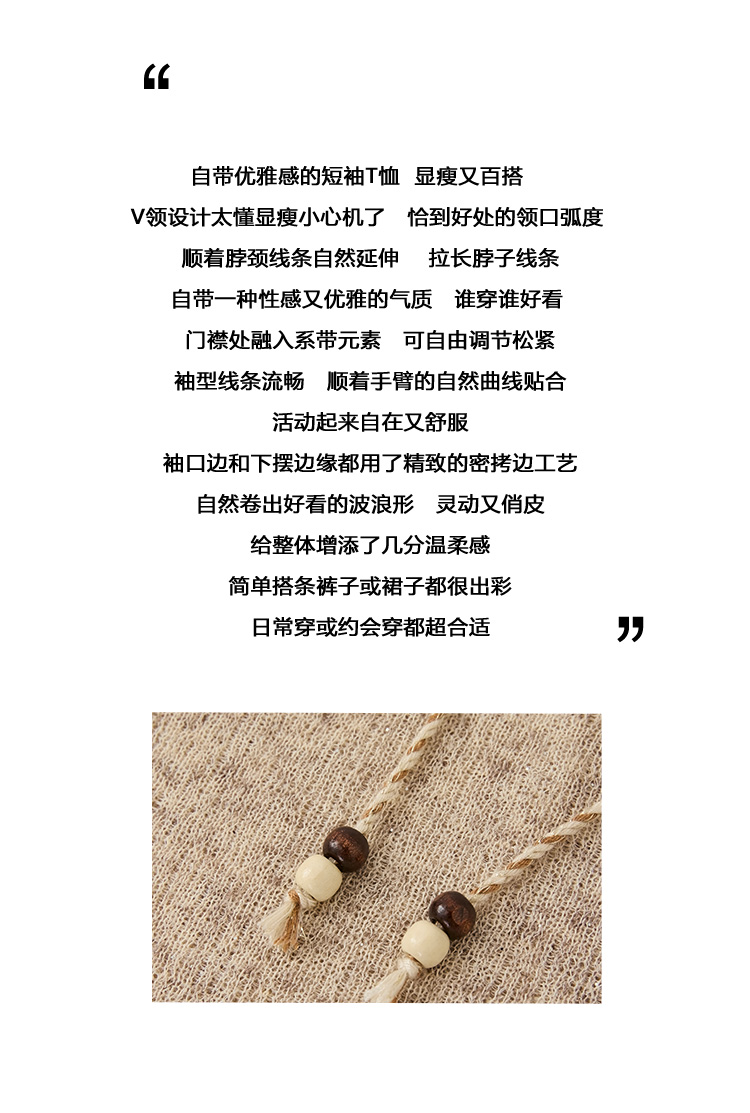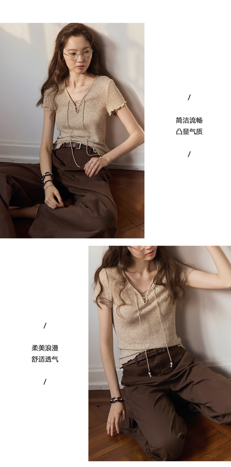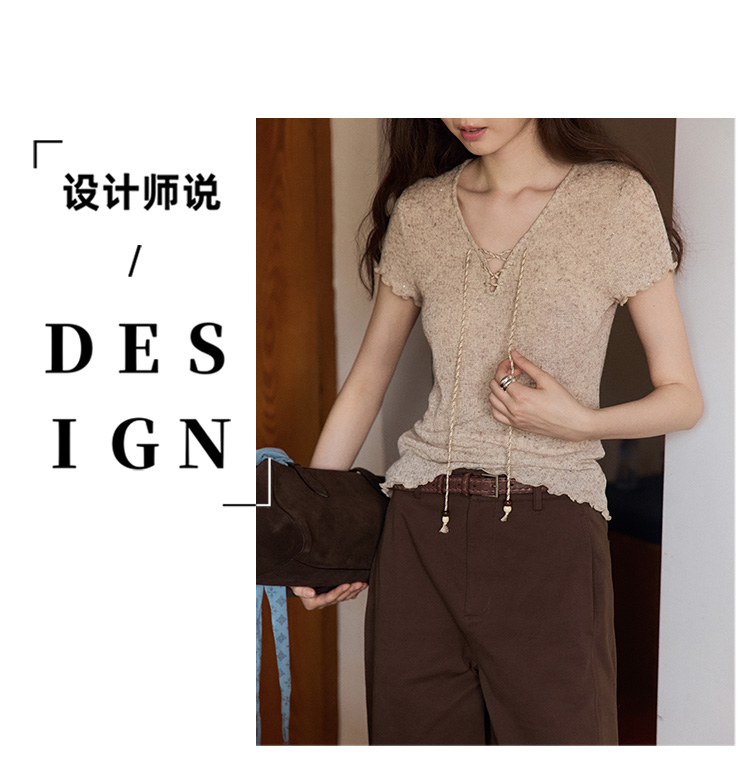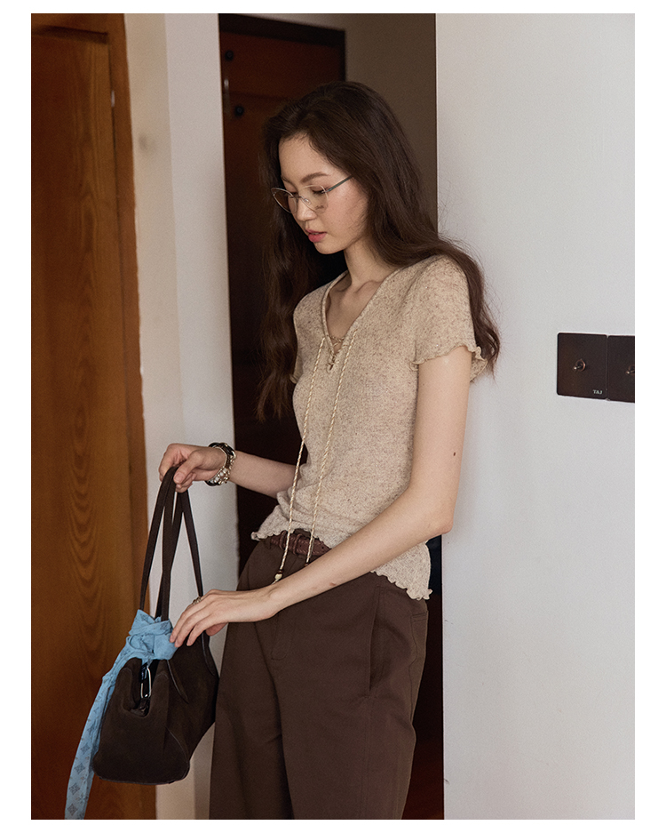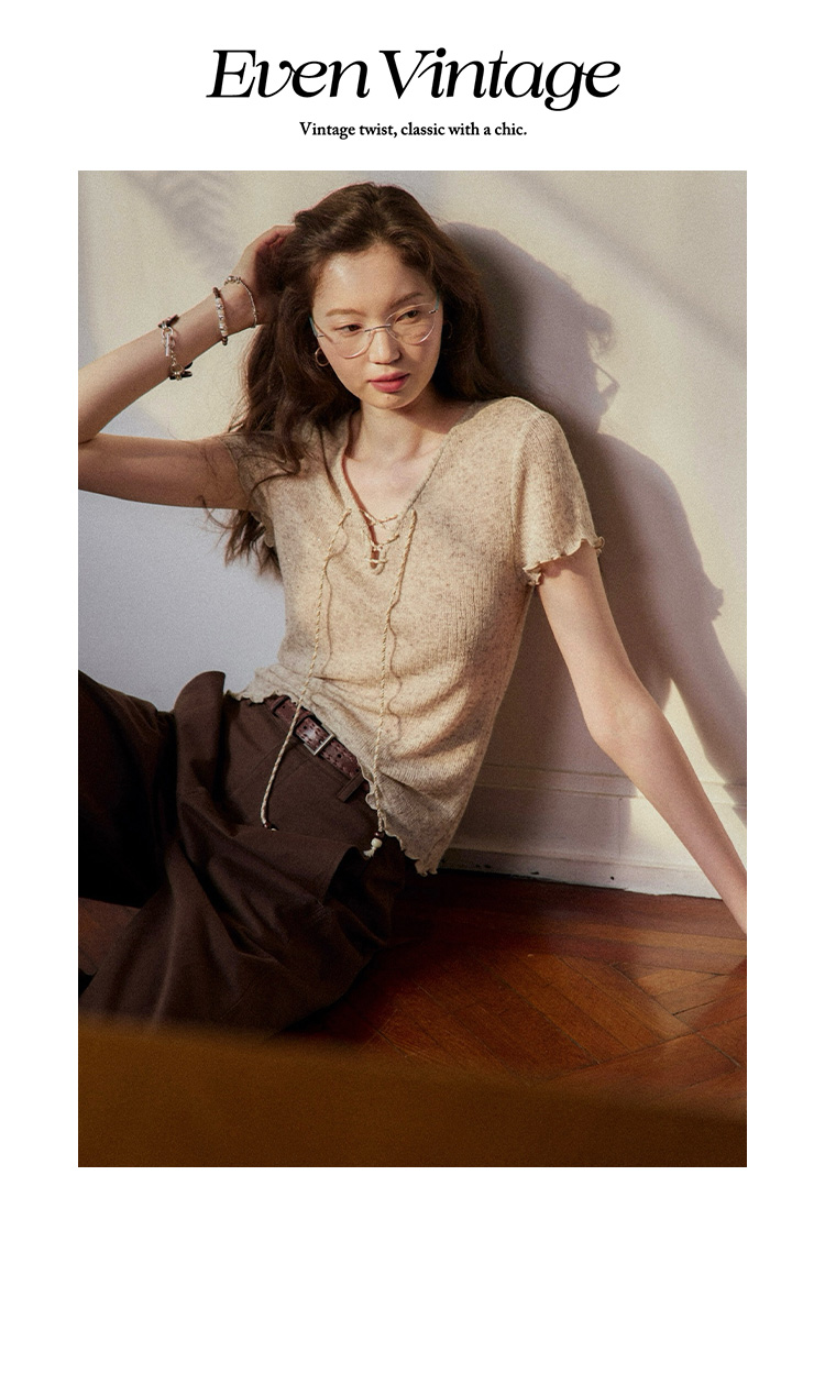 Even Vintage |亚麻混纺 闪闪微光V领系带复古针织透气短袖上衣
