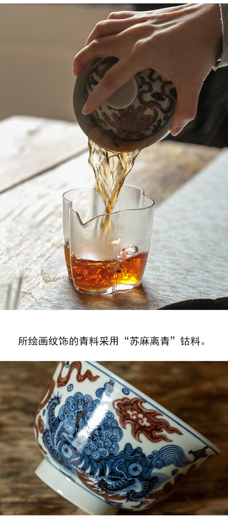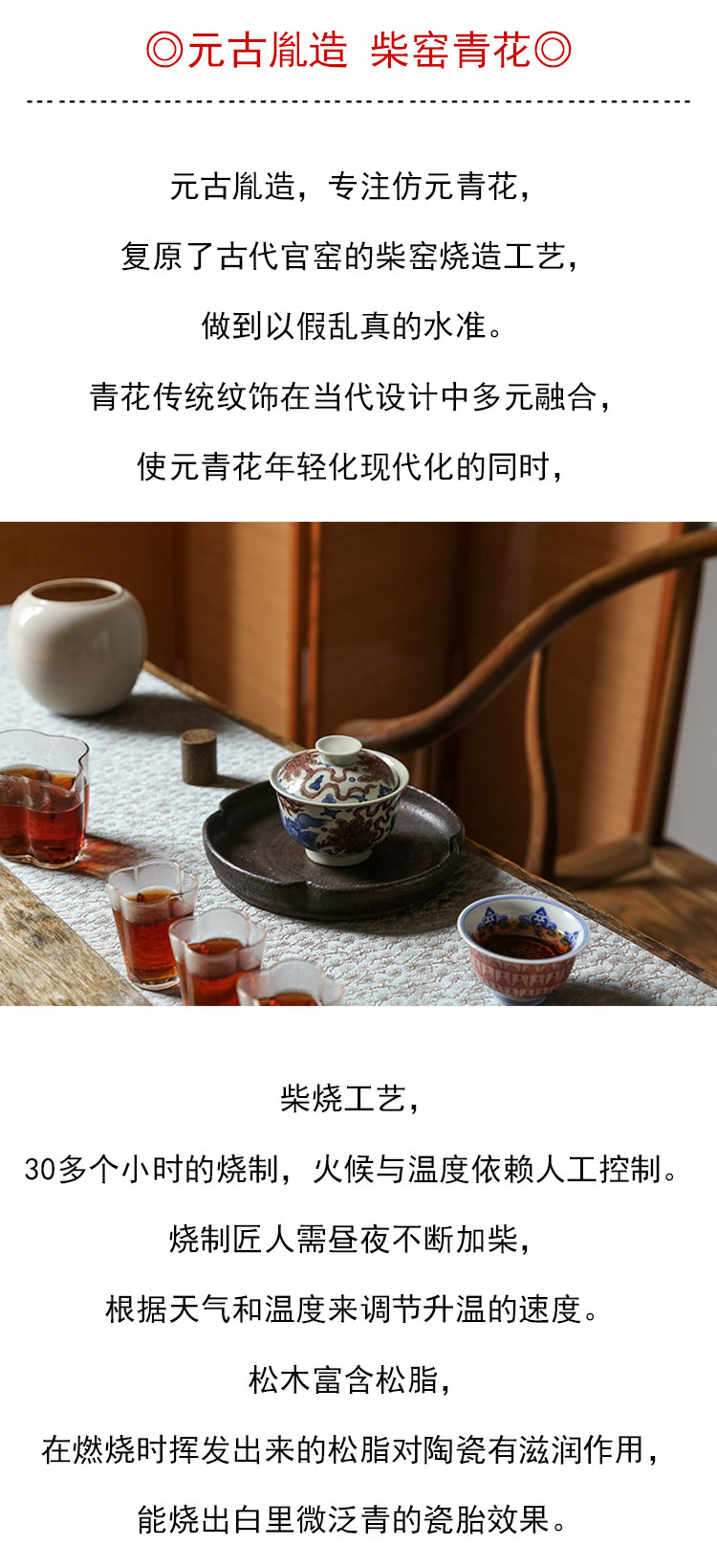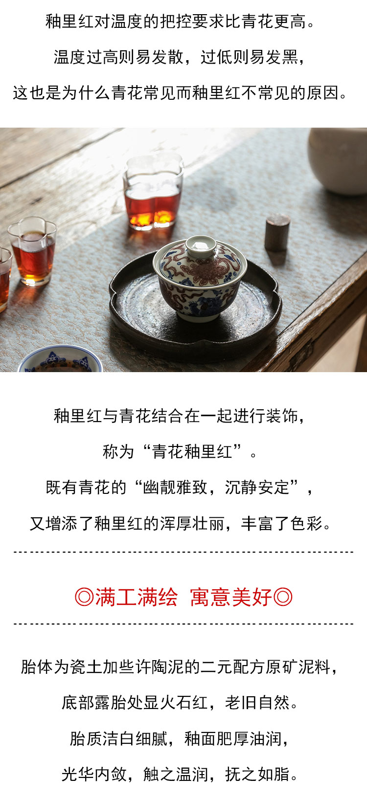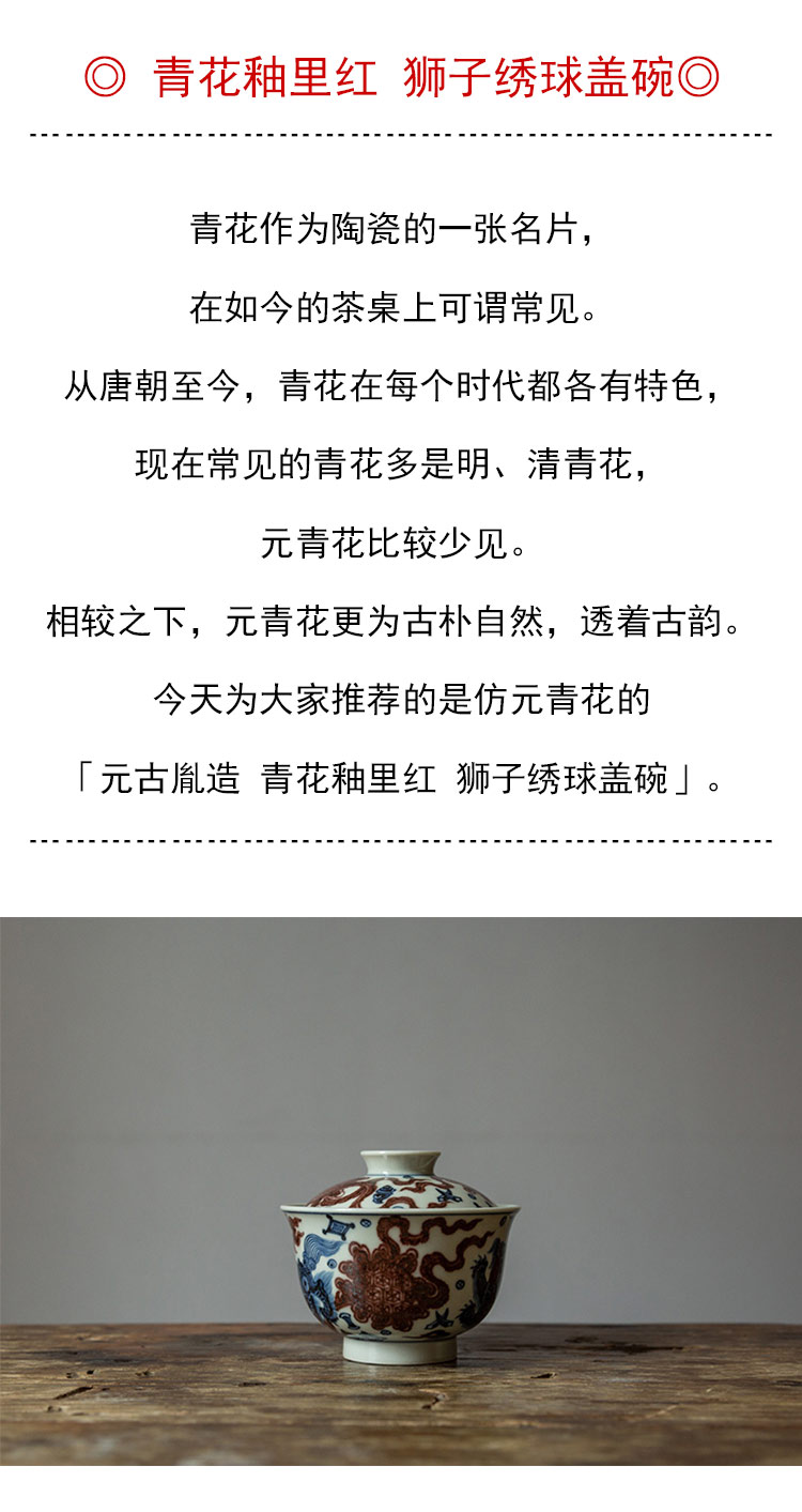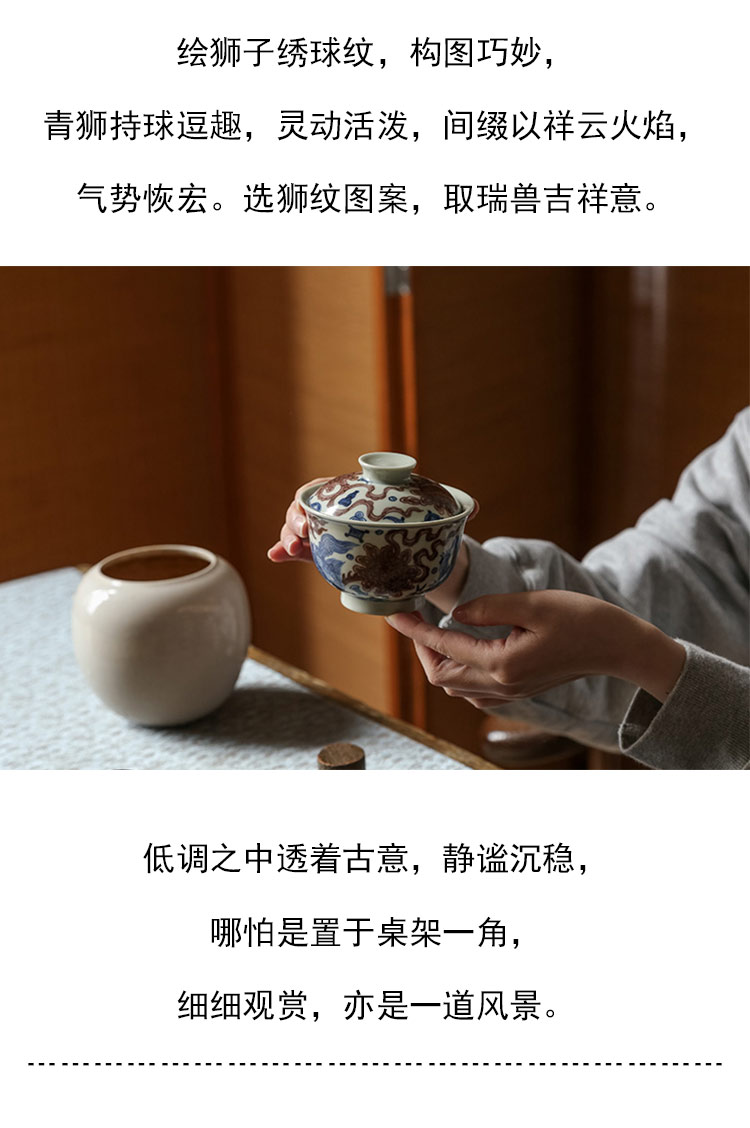 茶香记 元古胤造 青花釉里红 狮子绣球盖碗 柴窑青花 满工满绘 寓意美好