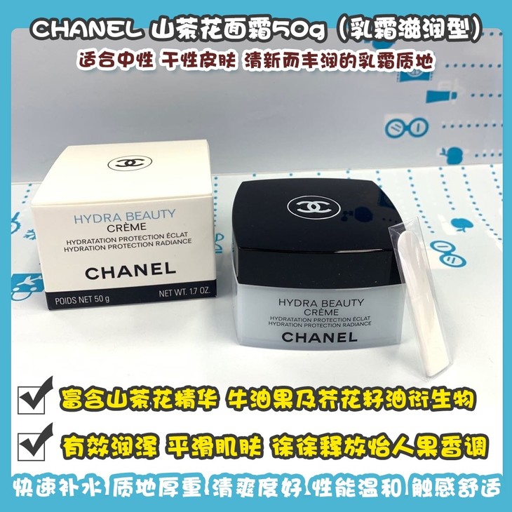 CHANEL 山茶花面霜50g(乳霜滋潤型)👍适合中性、干性皮肤。清新而丰润的乳霜质地,🌱富含山茶花精华、牛油果及芥花籽油衍生物,有效润泽、平滑肌肤,🥑徐徐释放怡人果香调与细腻的花香主调,滋润而细腻,保湿不油腻,舒缓柔润🌿,快速补水。质地厚重,清爽度好,性能温和,触感舒适,易于推开,不易引起粉刺🙅,是渴望每天舒缓柔嫩肌肤的你,理想的选择。✅