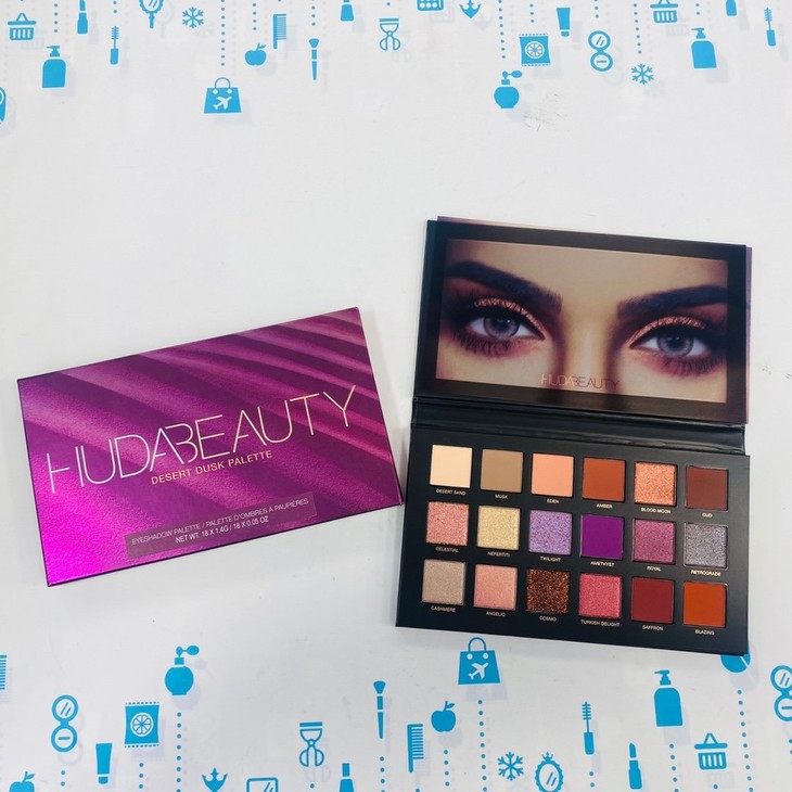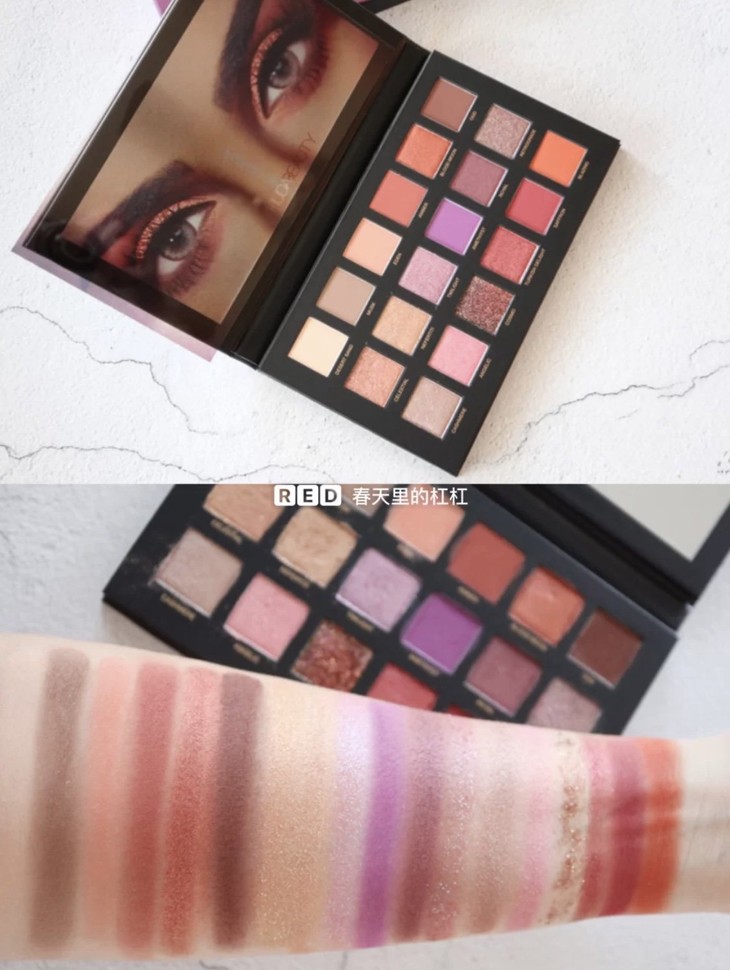 Huda beauty 18色沙漠玫瑰眼影盘 👍将沙漠黄昏的美景尽收其中🏜,两个色系,橘色调和紫粉色系将沙漠的落日余晖⛅和紫色的晚霞糅合在了一起,美不胜收!每一个颜色都很性格,偏光很美很闪,珠光色超显色,软糯☁~
