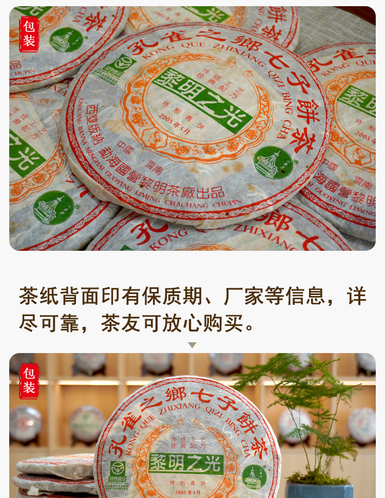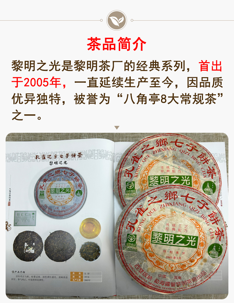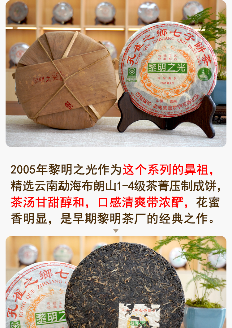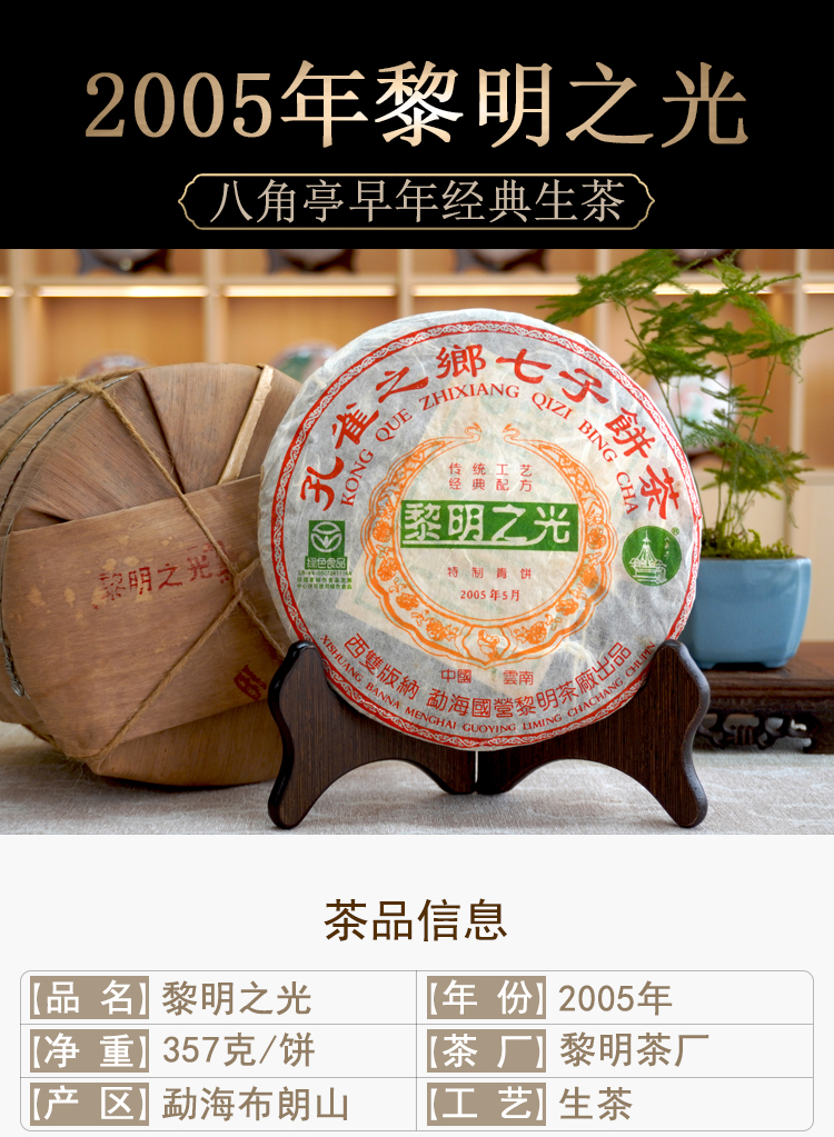 2005年黎明茶厂黎明之光孔雀之乡普洱茶生茶饼 老黎明经典茶品系列之一 好仓好回甘高性价比