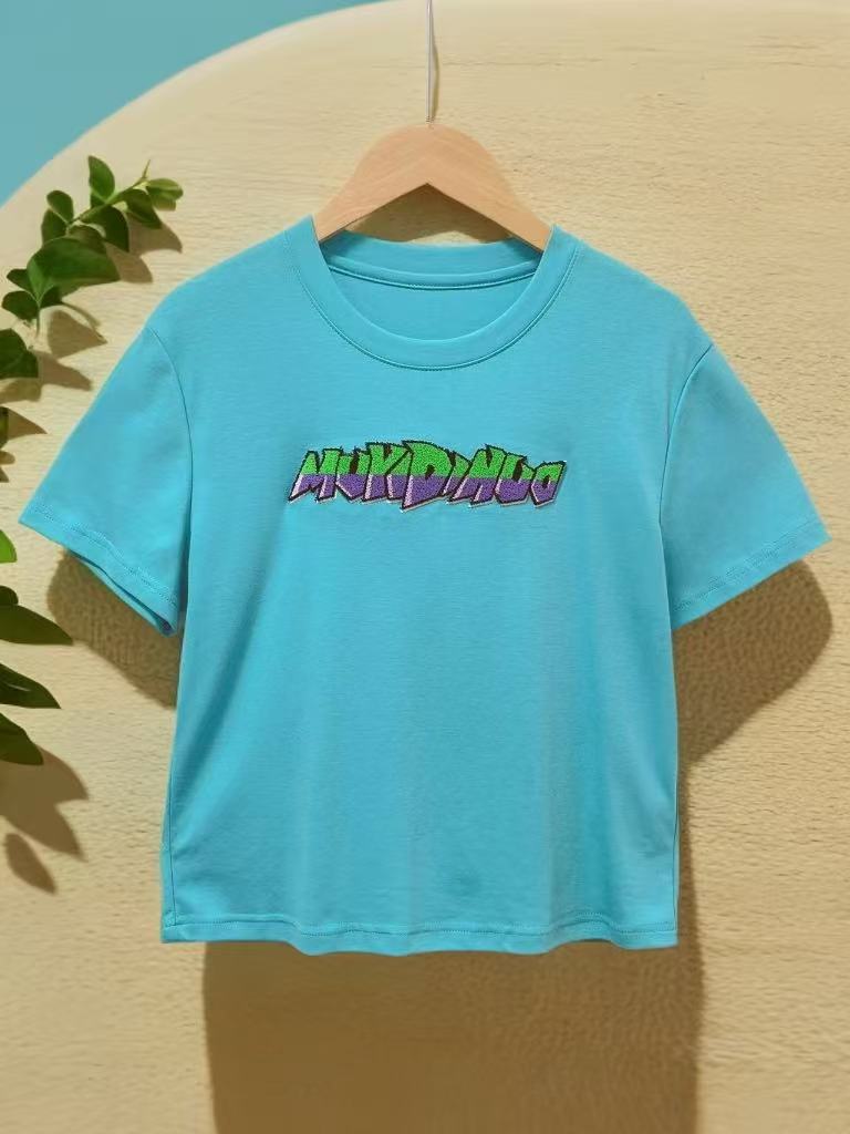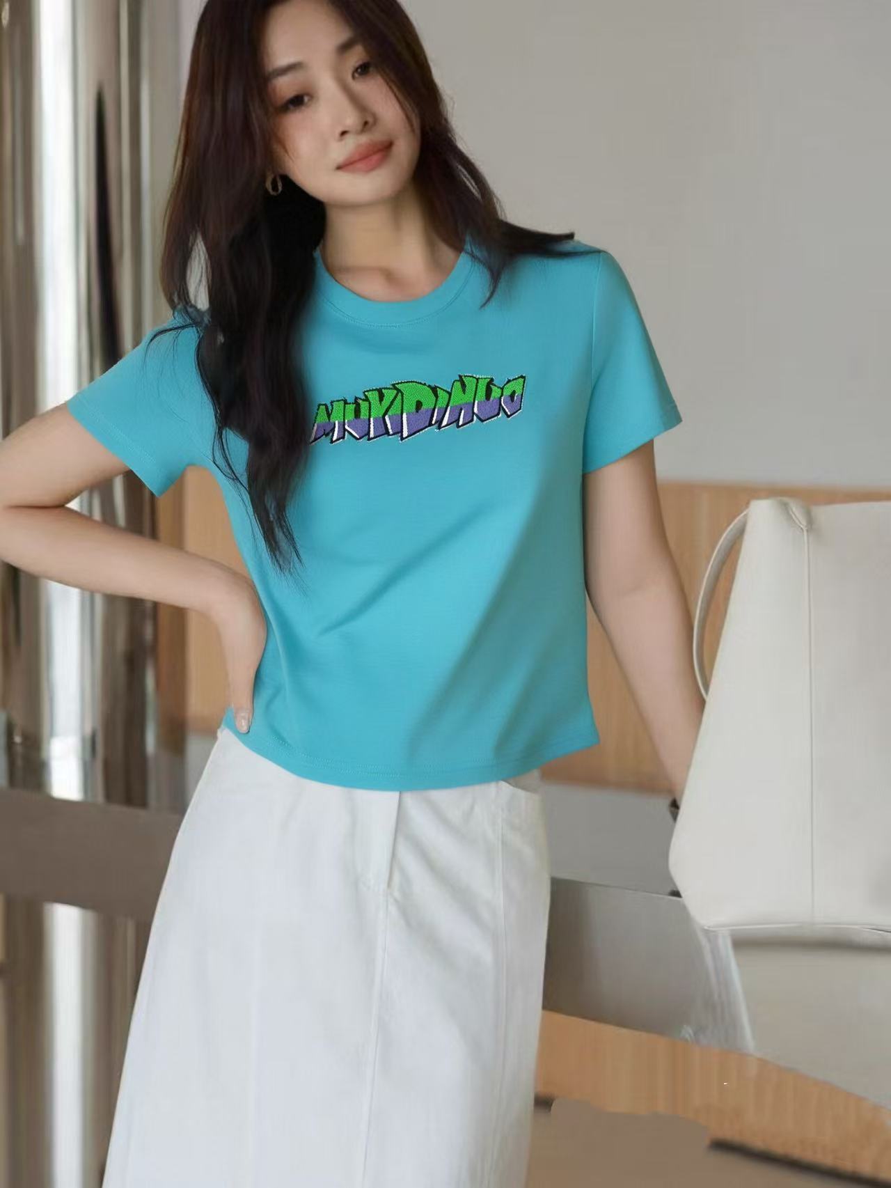清仓价2025~88123湖蓝牙刷绣短款短袖T恤-喜出