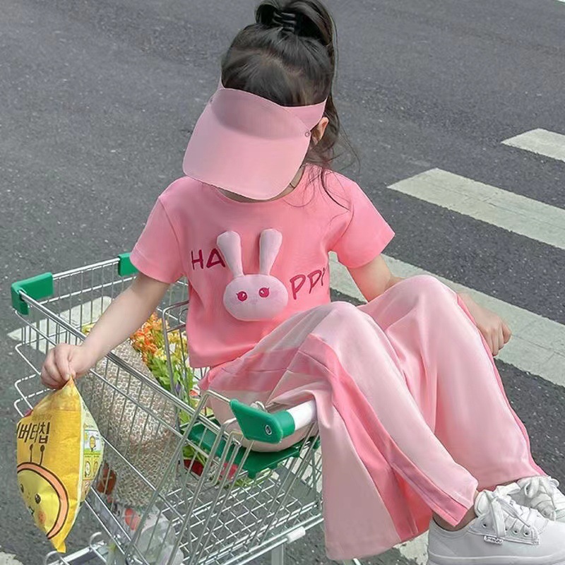 【女童夏装套装2023新款】儿童装洋气中小童时髦阔腿裤夏季两件套,后背蝴蝶结设计甜美时尚,前置可爱兔头sh