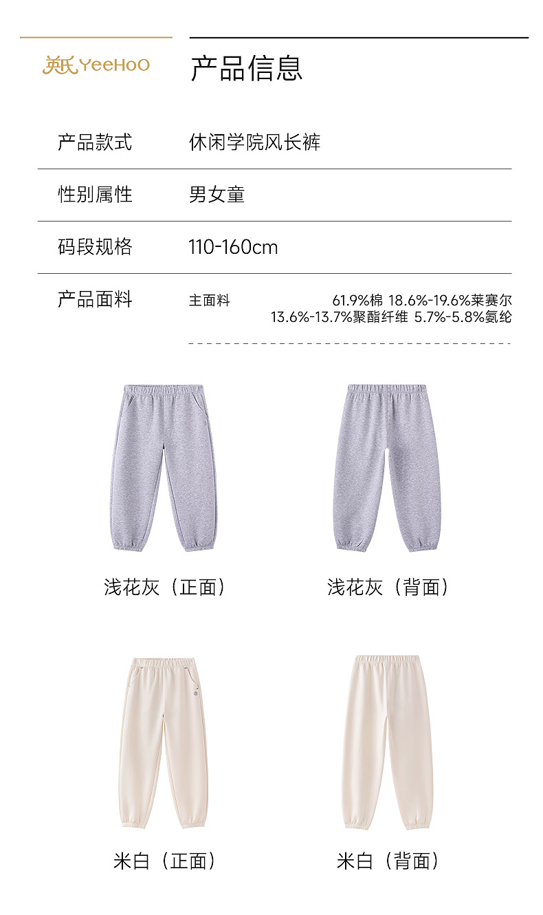 英氏儿童长裤男童女童春夏款裤子中大童休闲裤户外百搭简约长裤