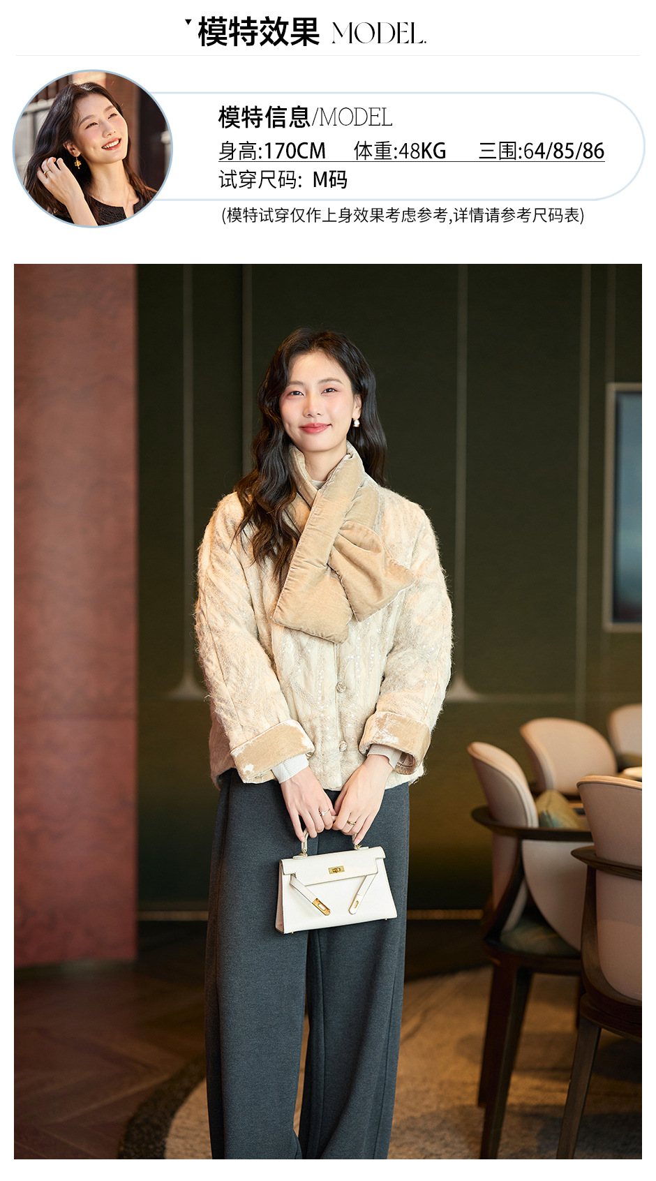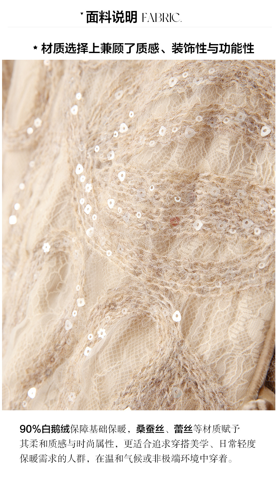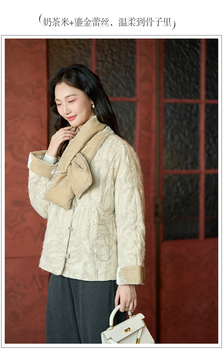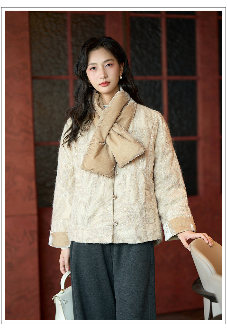 丁摩 桑蚕丝亮片白鹅绒外套女冬送围巾丝绒拼接保暖时尚短款5ZF-76070