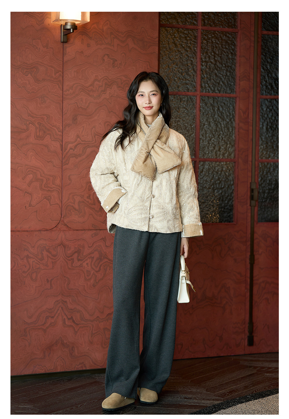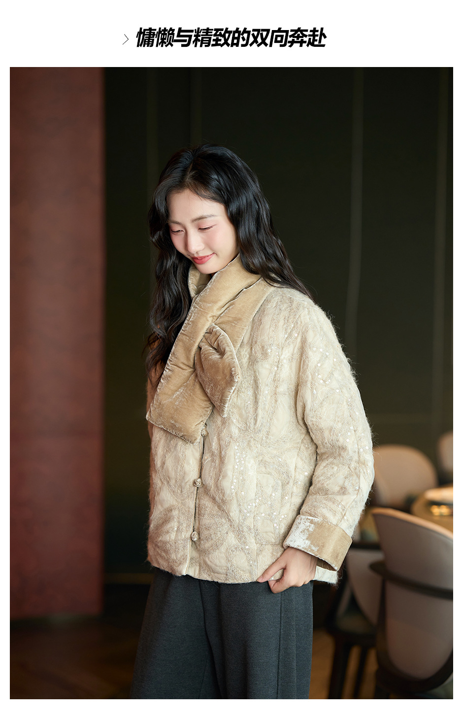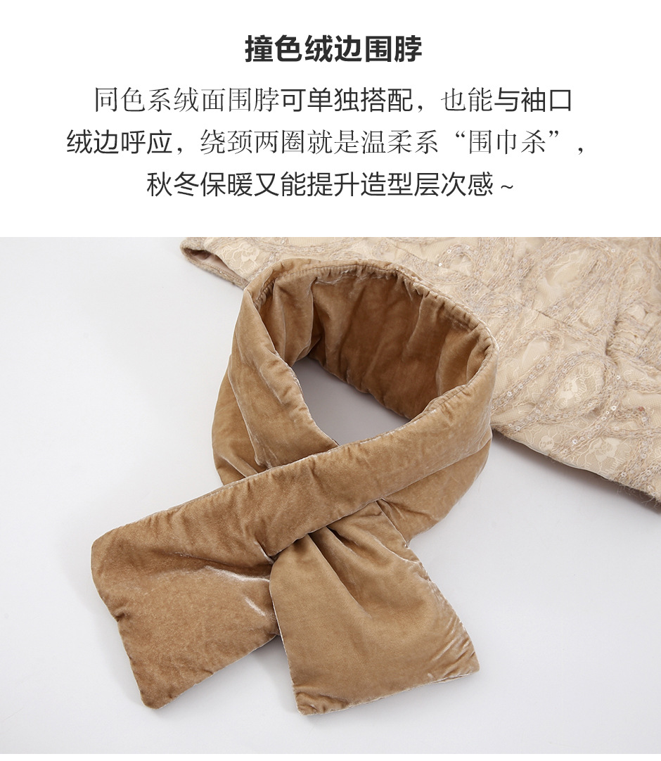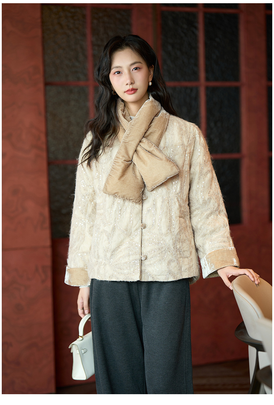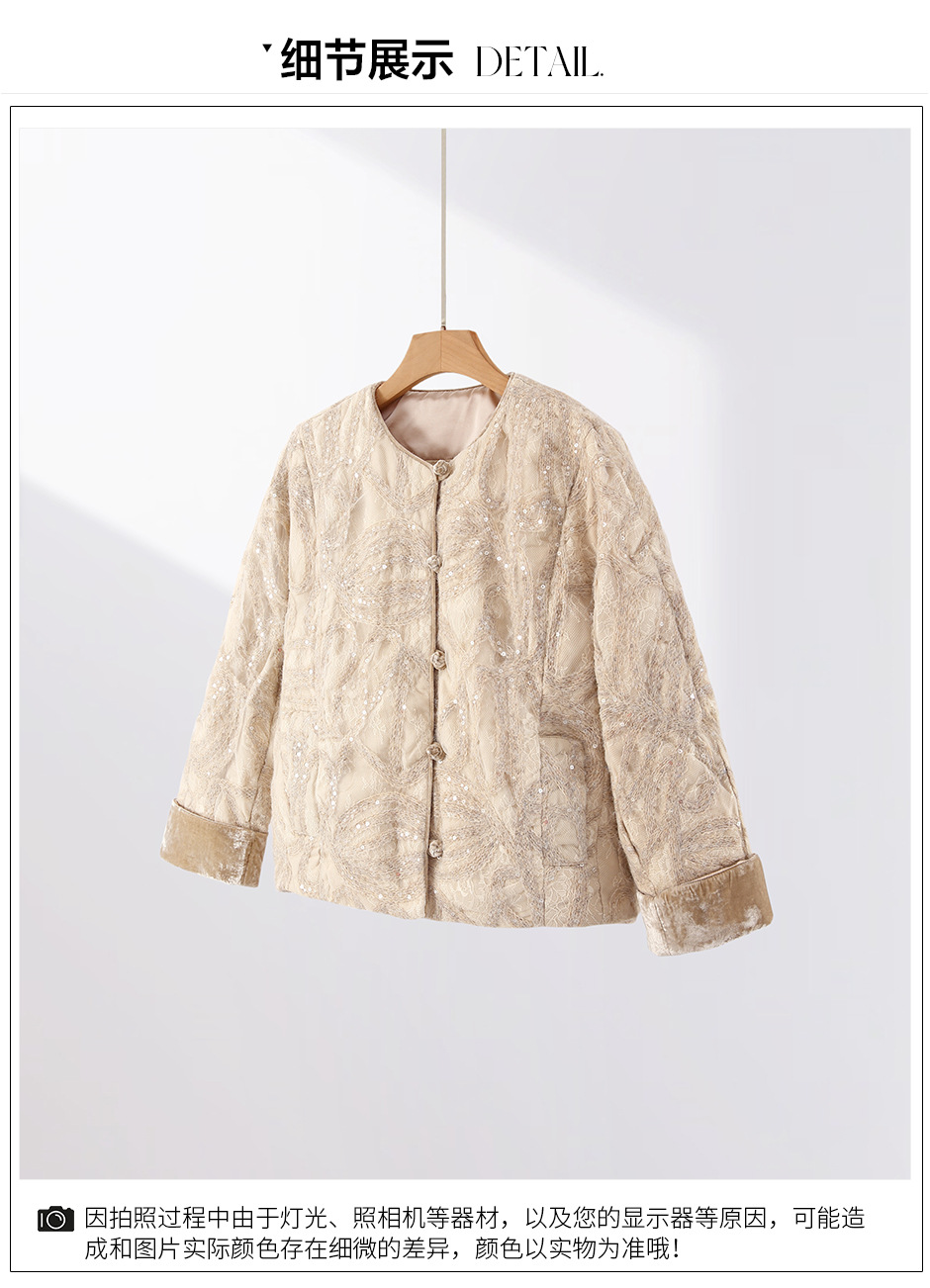 丁摩 桑蚕丝亮片白鹅绒外套女冬送围巾丝绒拼接保暖时尚短款5ZF-76070