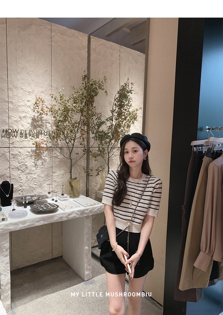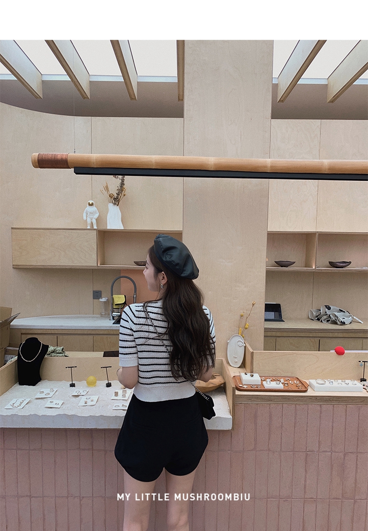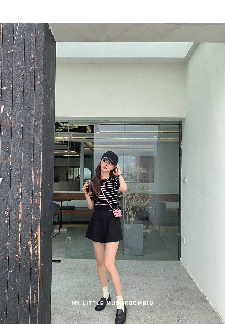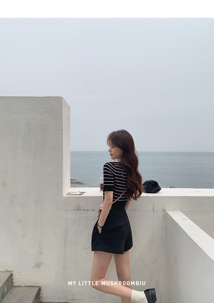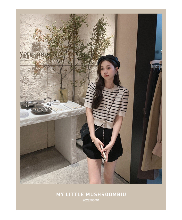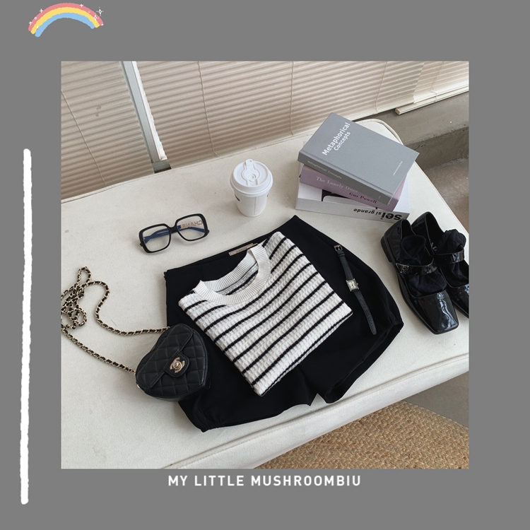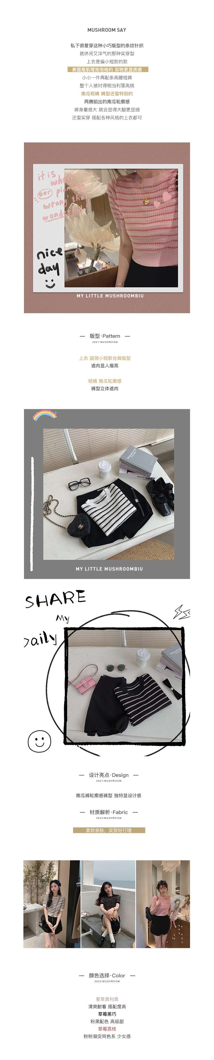 南瓜短裤 金蘑菇菇【日出告白】法式条纹短袖针织上衣+南瓜短裤甜美休闲