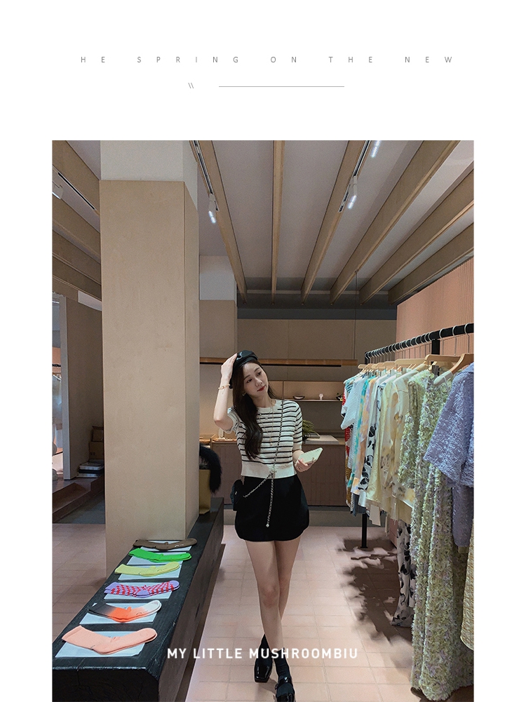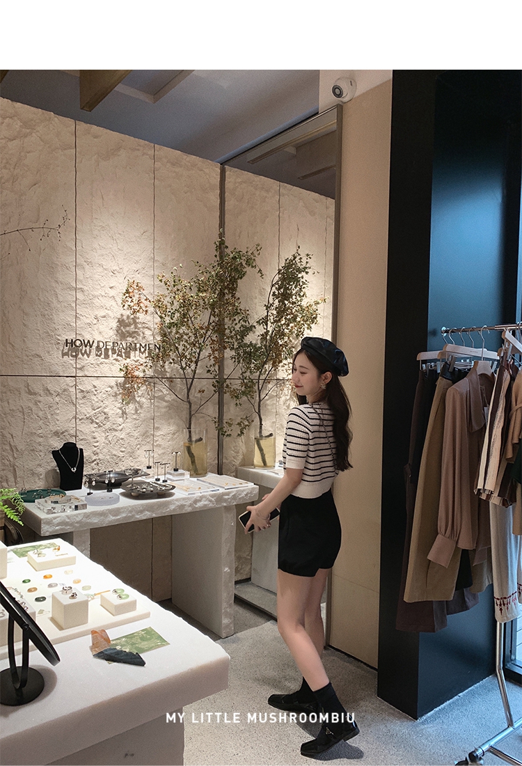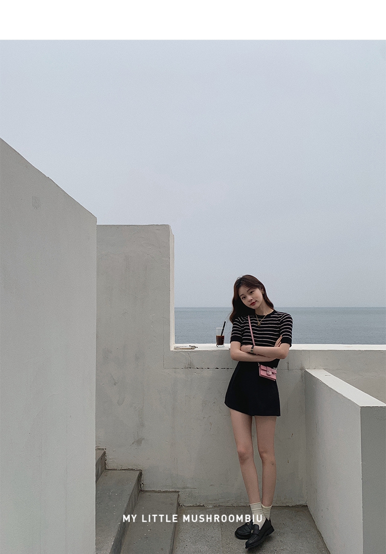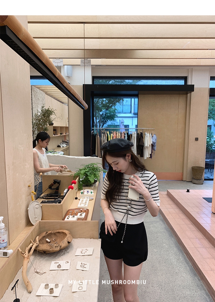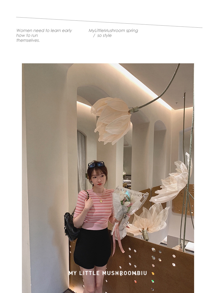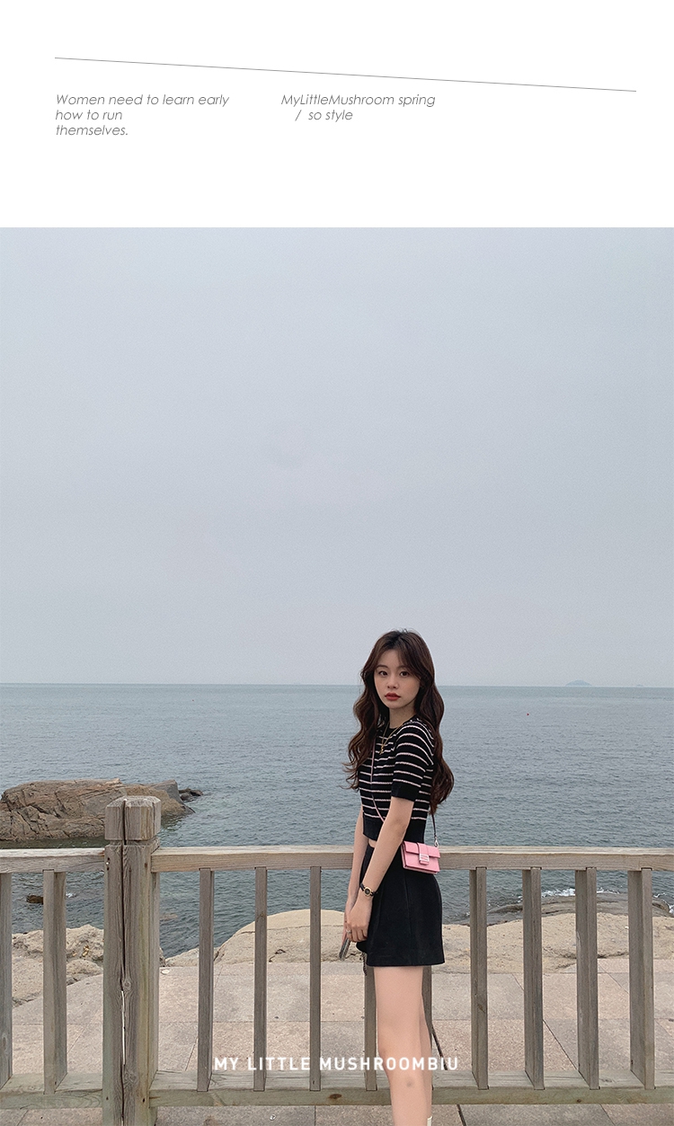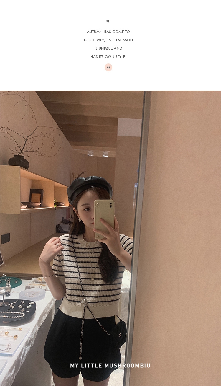 南瓜短裤 金蘑菇菇【日出告白】法式条纹短袖针织上衣+南瓜短裤甜美休闲