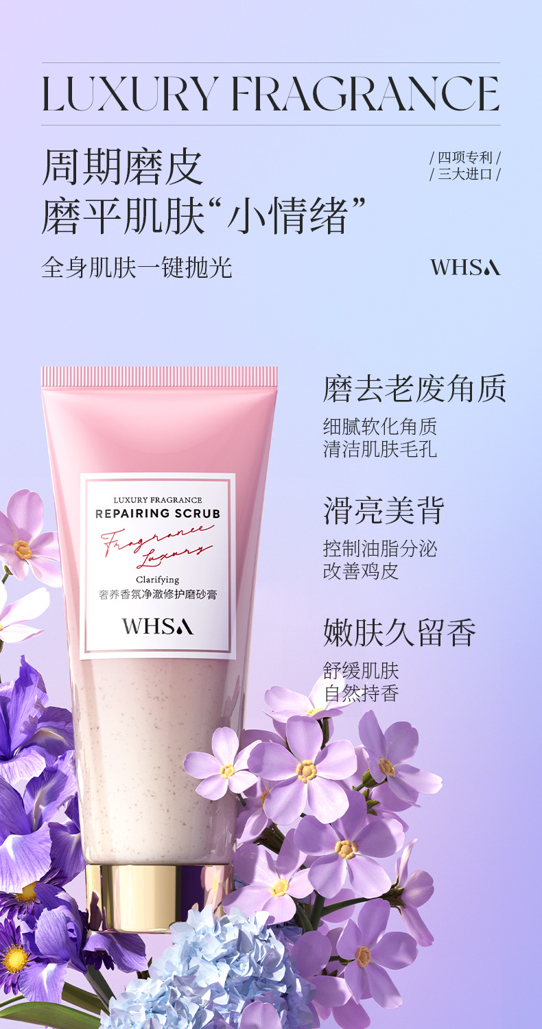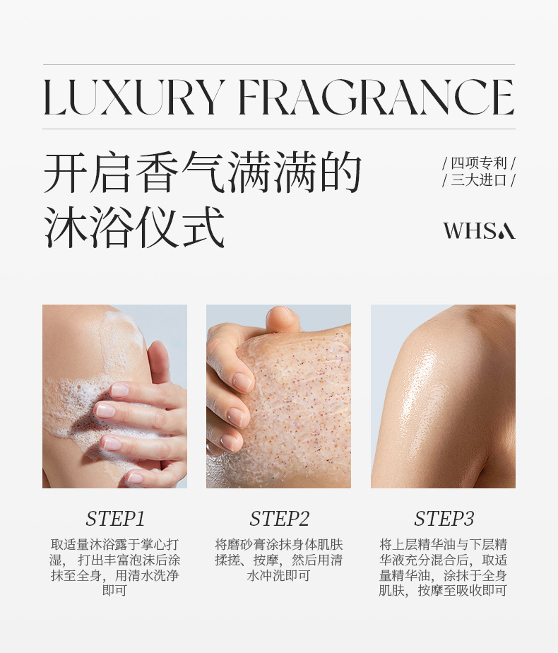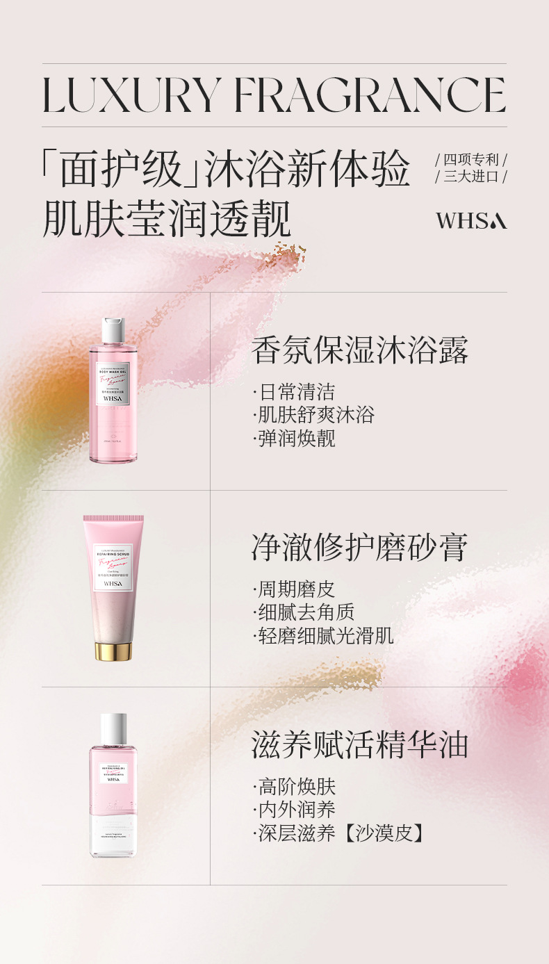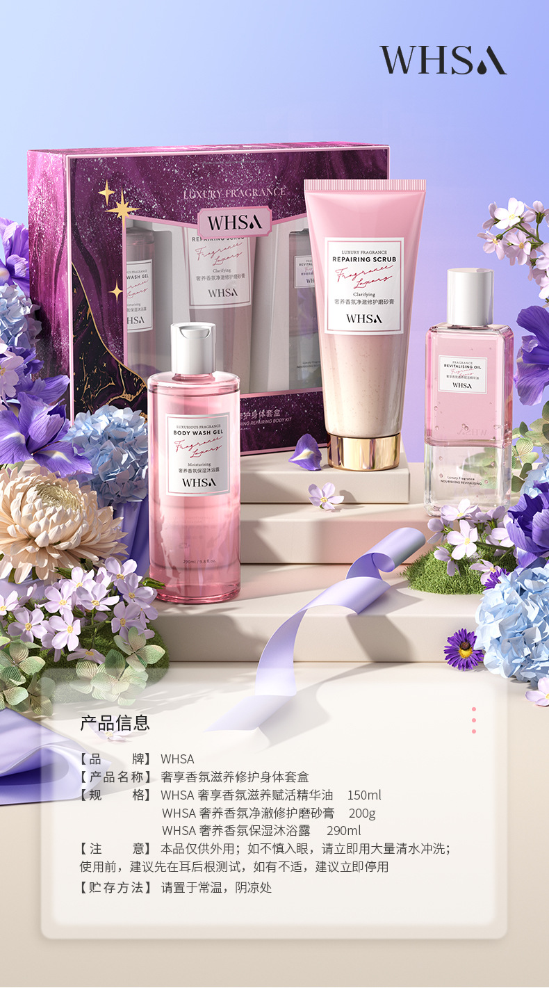 【柔润放松!滑亮美背】Whsa奢享香氛身体套盒 洗澡用沐浴露磨砂膏身体去角质家庭套装。xb