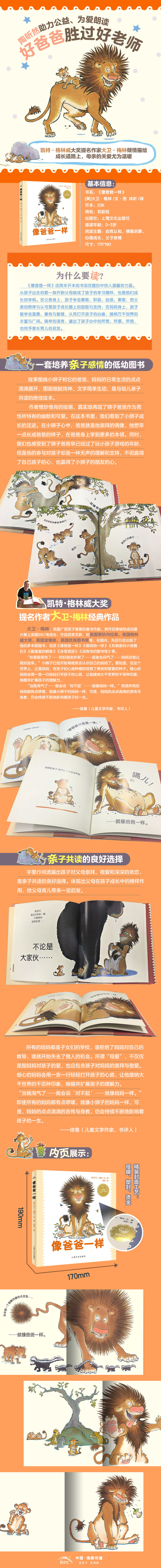《像爸爸一样》是一本聪明的杰作。作者惟妙惟肖的绘画,真实地再现了狮子爸爸作为男性所特有的幽默和可爱。在这本书里,我们看到了小狮子成长的足迹。在小狮子心中,爸爸就是他崇拜的偶像,他想早一点长成爸爸的样子,在爸爸身上学到更多的本领。同时,我们也感受到了狮子爸爸早已经过了玩小孩子游戏的年龄,但是他的参与对孩子却是一种无声的理解和支持,不但赢得了自己孩子的心,也赢得了小狮子的朋友的心。