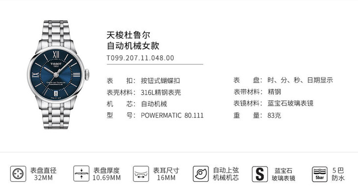 | 防水 | 50 m | 表带 | 精钢表链 按钮式蝴蝶扣 |