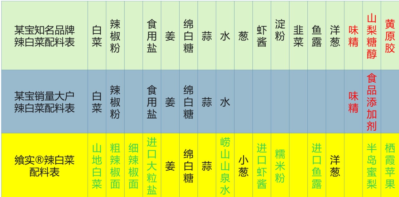 辣白菜做法讲究调味丰富,秘制酱料是辣白菜的灵魂,市面上很多辣白菜寡淡无味,价格低廉,做泡菜的原料放几种就作罢,而阿祖玛辣白菜用料达13味之多。