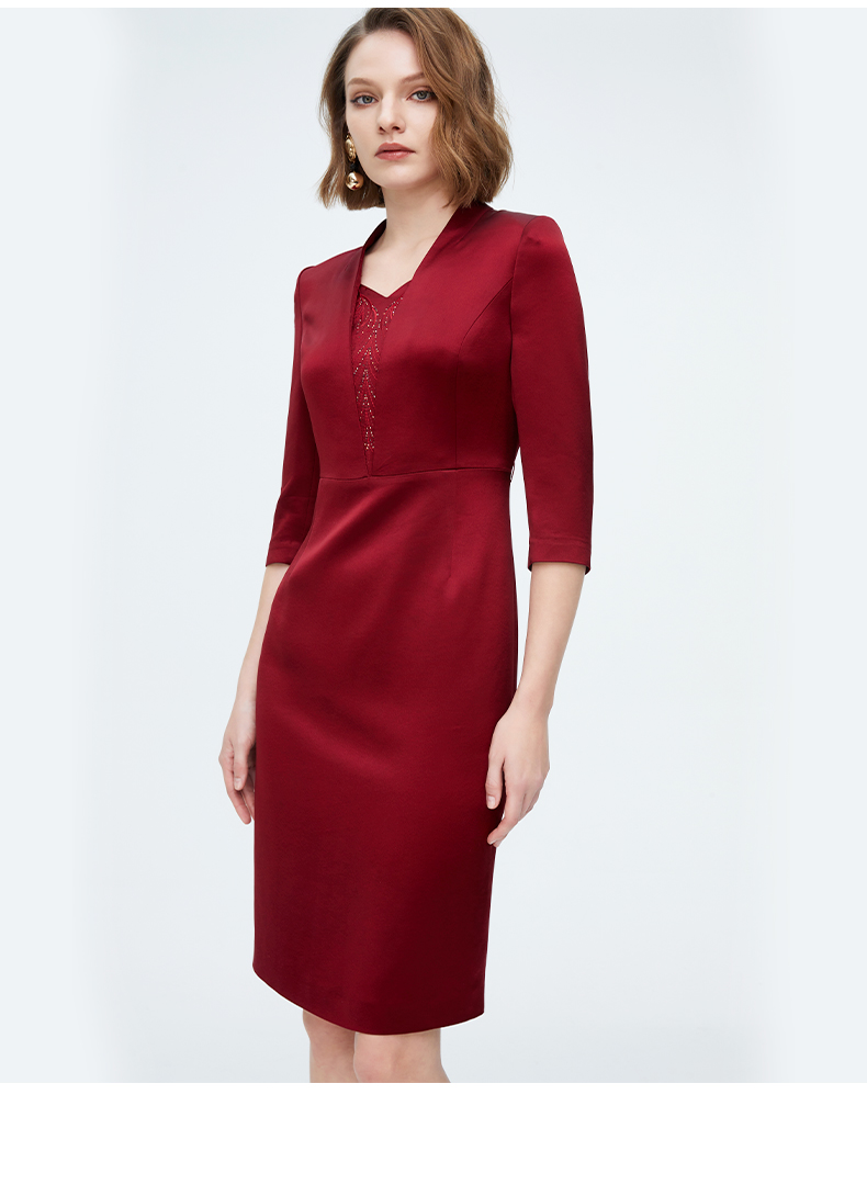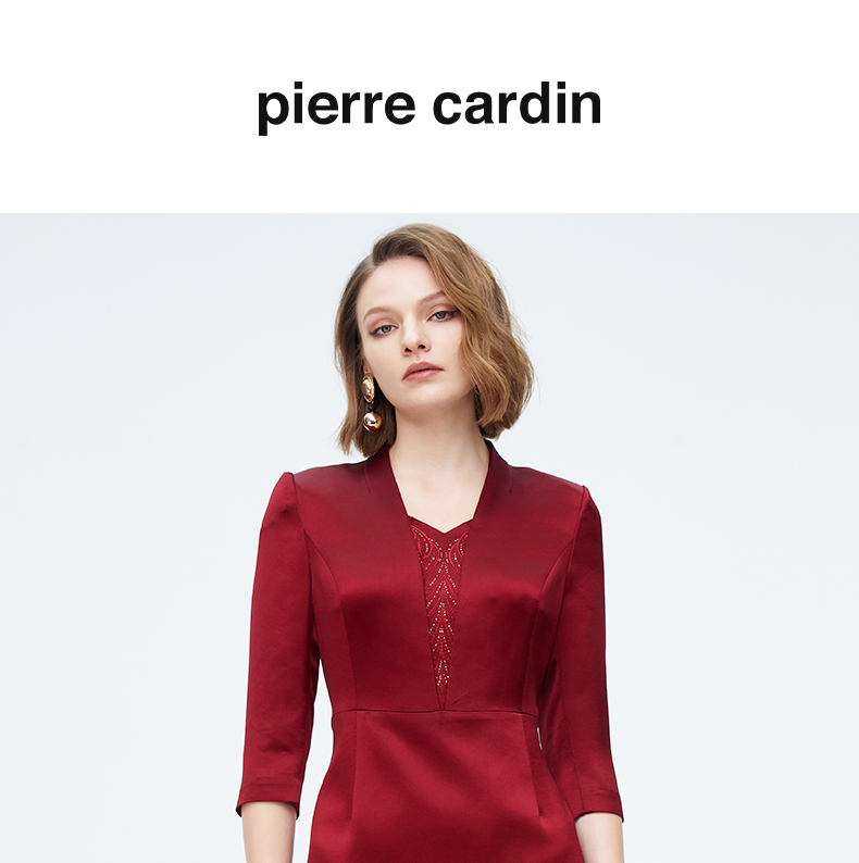 皮尔卡丹女装蕾丝拼接羊毛毛呢红色长袖连衣裙P0318DL03R0