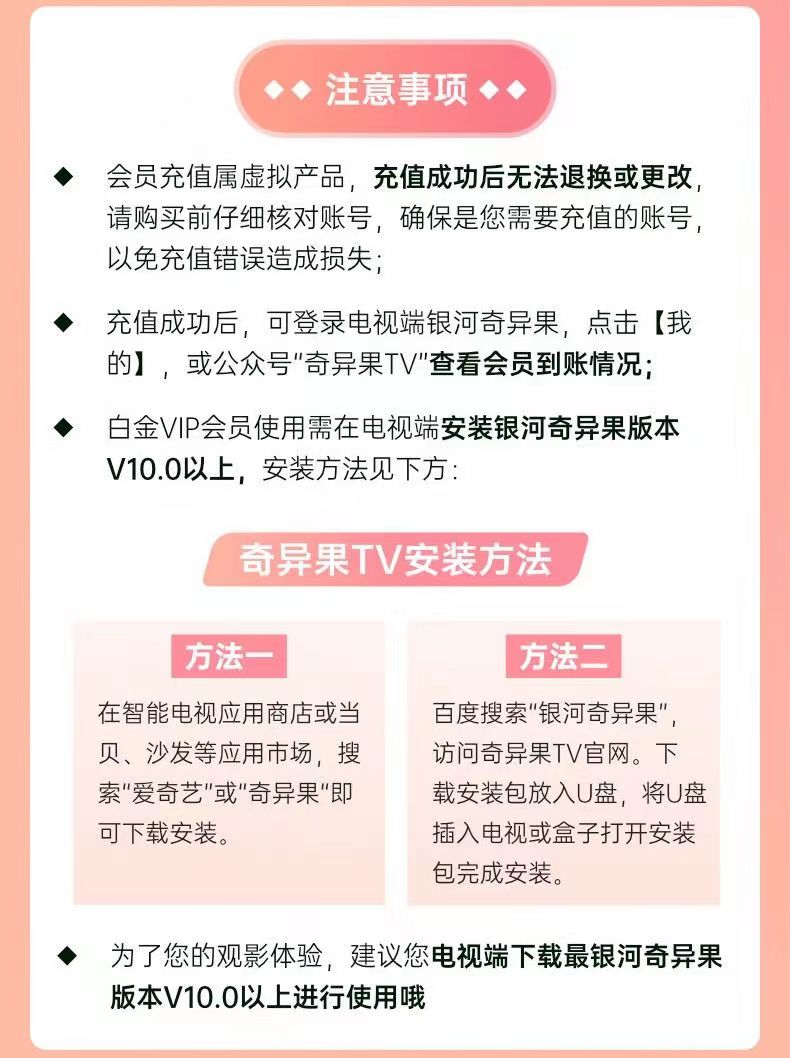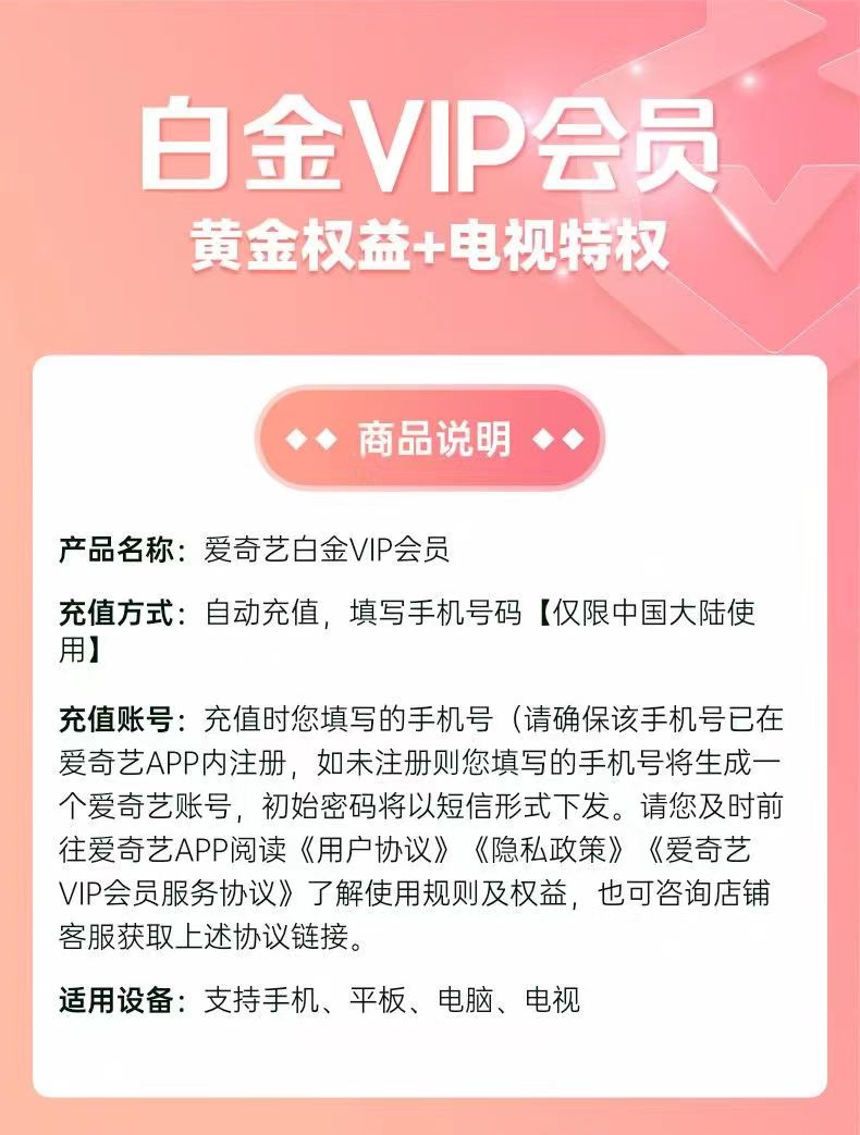 购买须知: ★ 下单前请您务必仔细阅读产品中各项说明,然后在下单订购 ★ 下单购买后,则视为您已仔细阅读本产品中的各项说明,并认同此声明以及产品规则,否则责任自负,不在售后服务之内 产品说明: 支持端口:手机、Pad、电脑、电视 充值账号:请填写爱奇艺登录绑定的手机号,不支持在备注填写充值号码,仅支持下单默认的充值手机号,请不要填错 充值时间:本产品为快速直充,下单后3-30分钟左右到账 购买限制:每笔订单限购1单,多次购买请分开下单 到账核实:下单后10分钟未到账,请先登录自己的账号查看,退出重新登录查看,如确实未到账,请及时联系客服 注意事项: 顾客下单后自动充值,发货状态并不会立刻变成已发货,已经充值成功无法退换 虚拟充值产品不适用于七日无理由退货条款,一经购买,不退不改 因个人原因造成充值错误,责任自负,不予退款 如遇市场断货问题,平台将无条件为客户进行退款 |