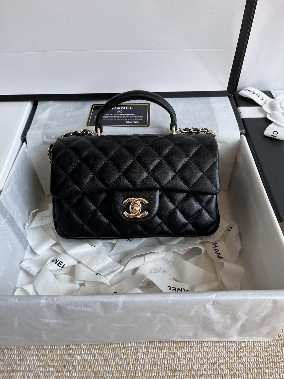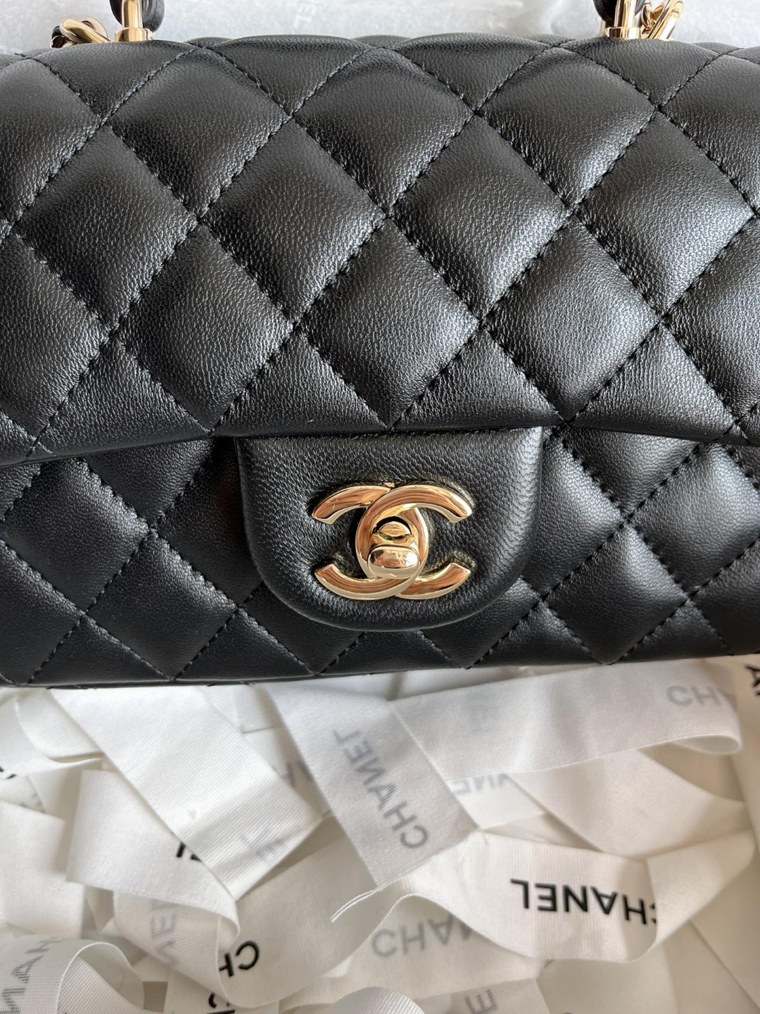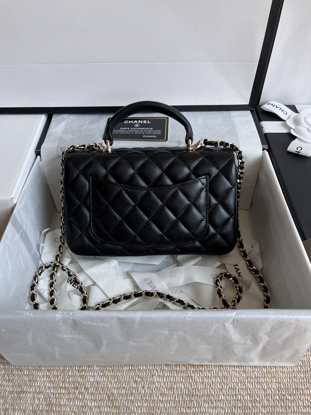 小羊皮的光泽感和质感细腻,淡金扣考究,日常出门大小刚好,有链条+手柄 :斜挎/手拎 ,高级百搭