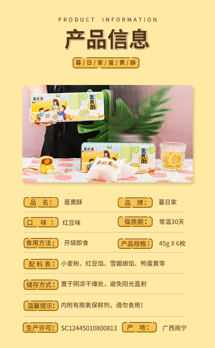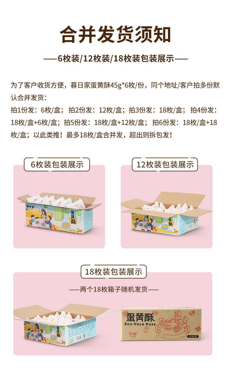 为了客户收货方便,暮日家蛋黄酥45g*6枚/份,同个地址/客户拍多份默认合并发货: