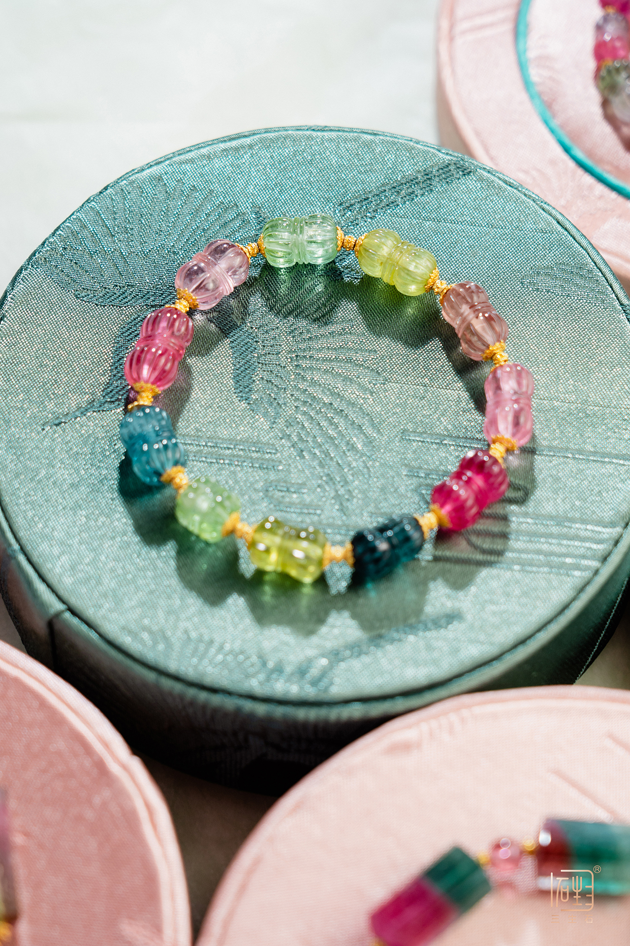 —— 精品彩色碧玺并蒂莲足金设计手链