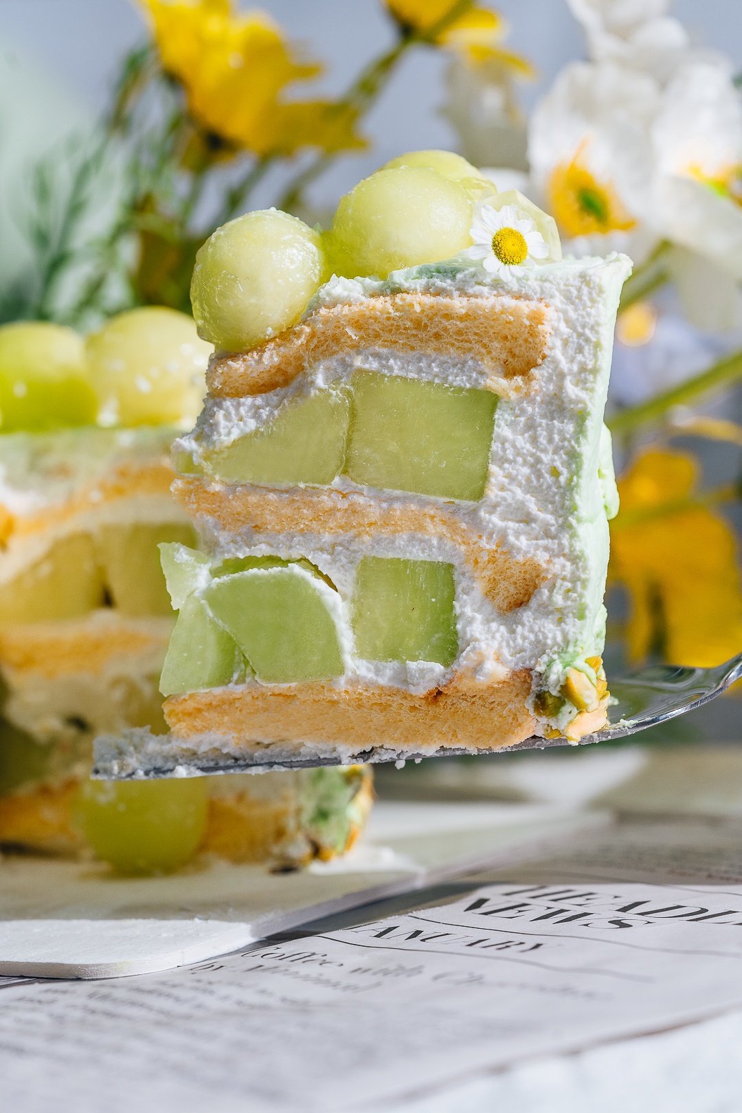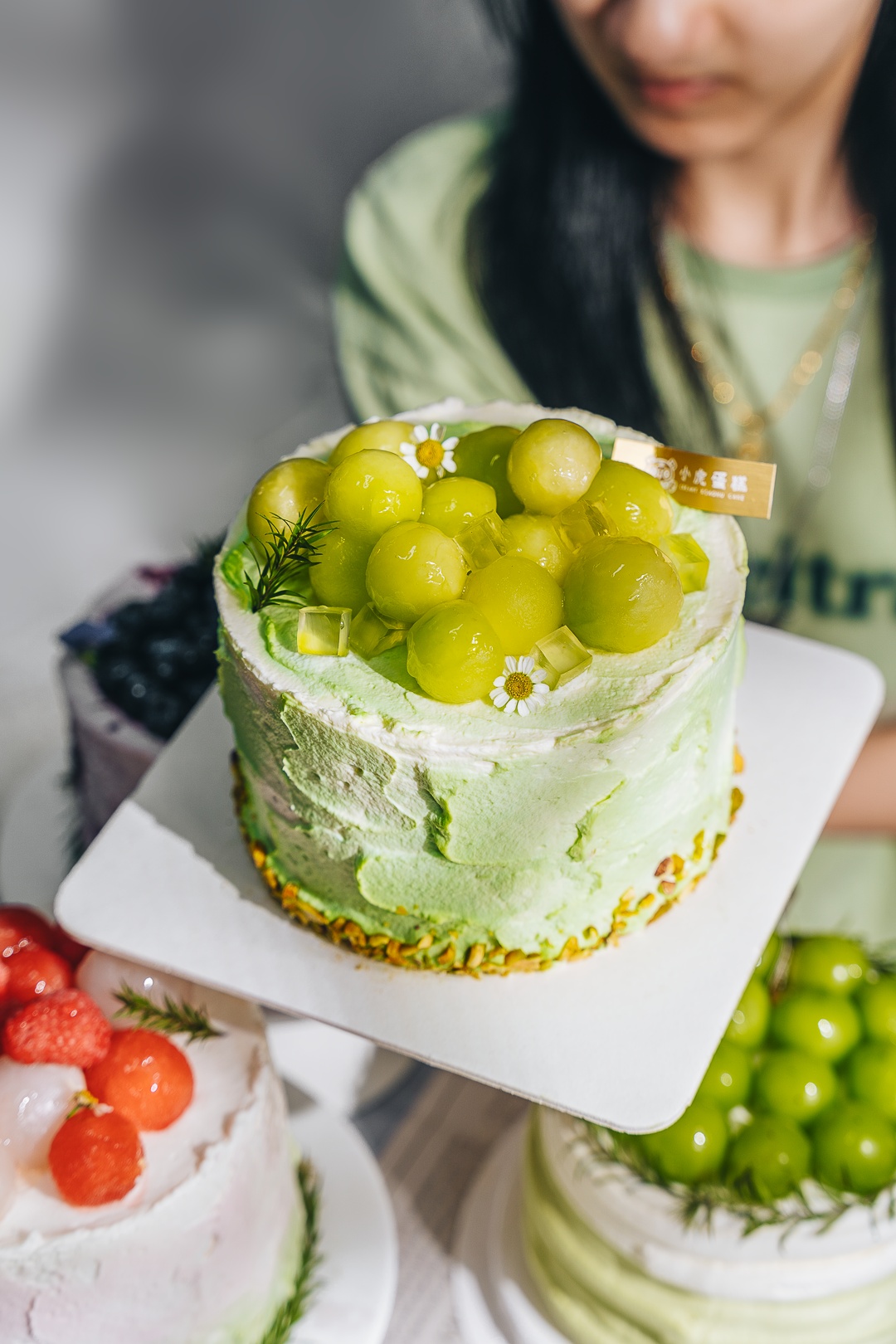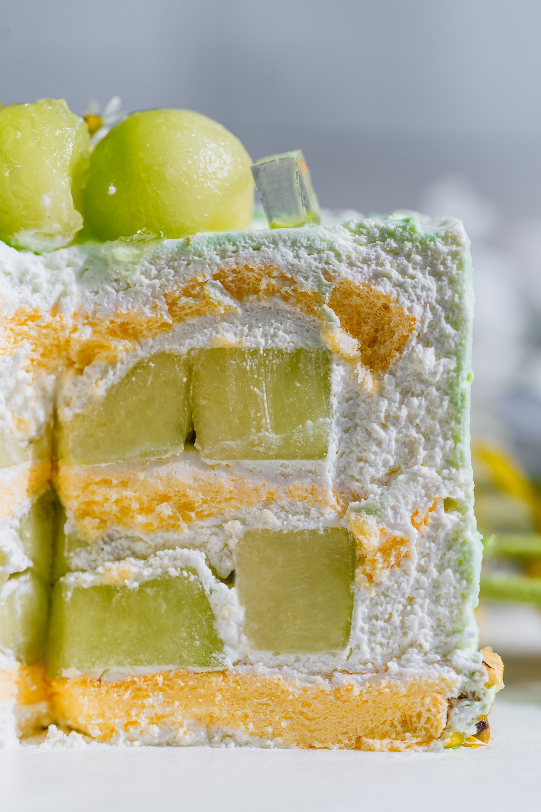 温馨提示: 由于蛋糕顶部蜜瓜使用竹签固定,食用前务必注意移除!