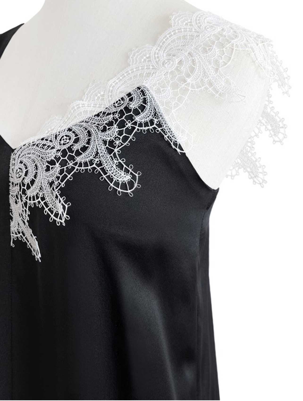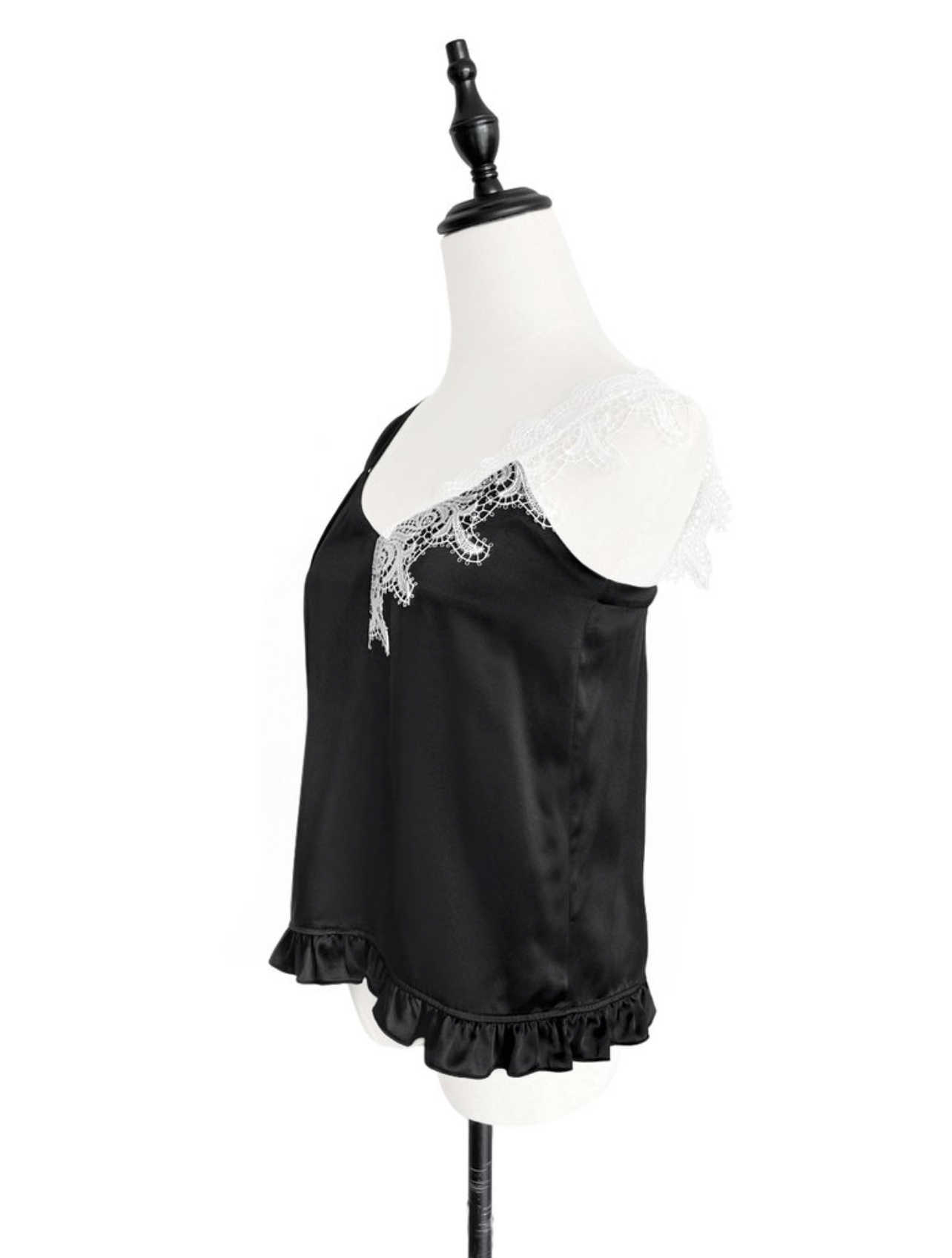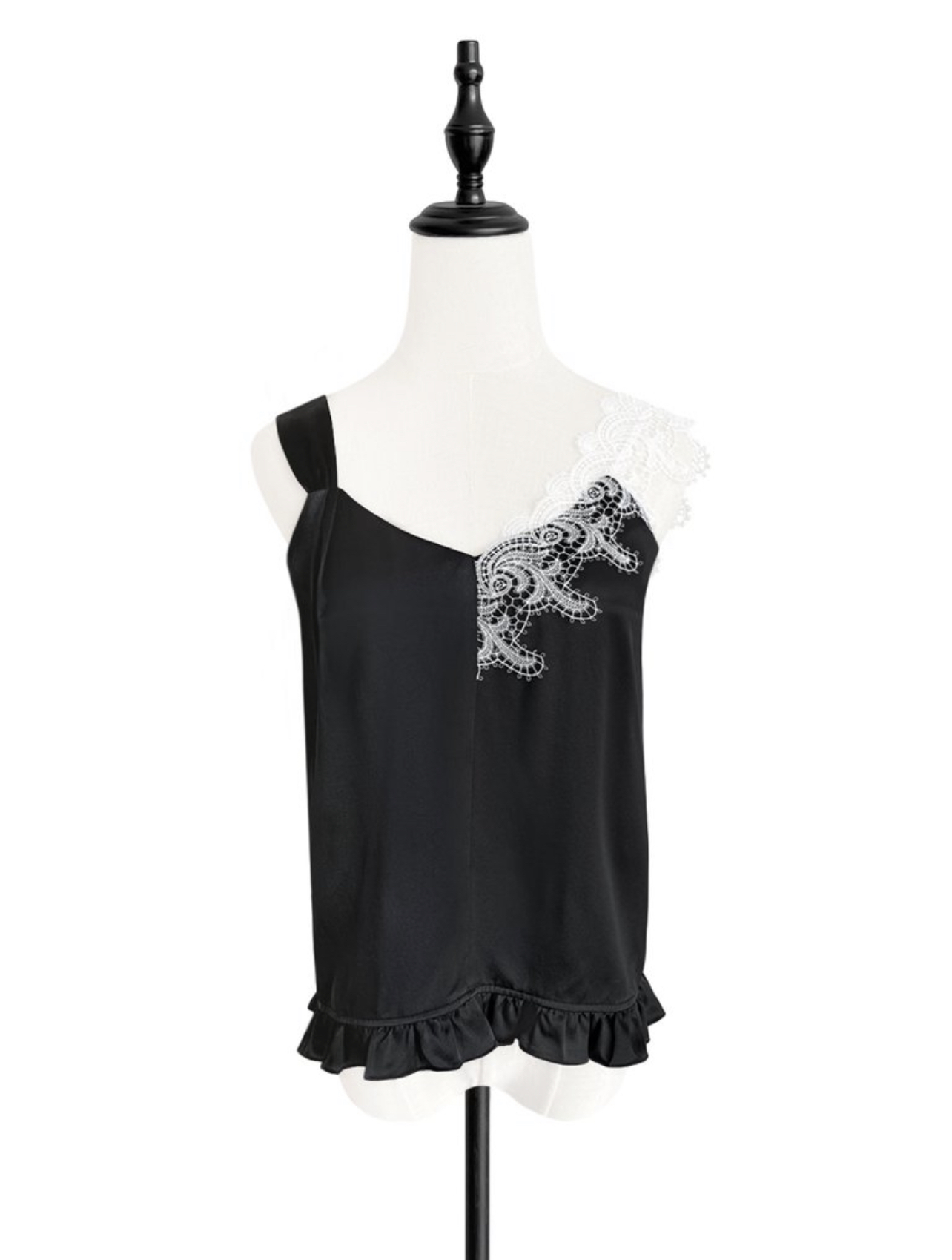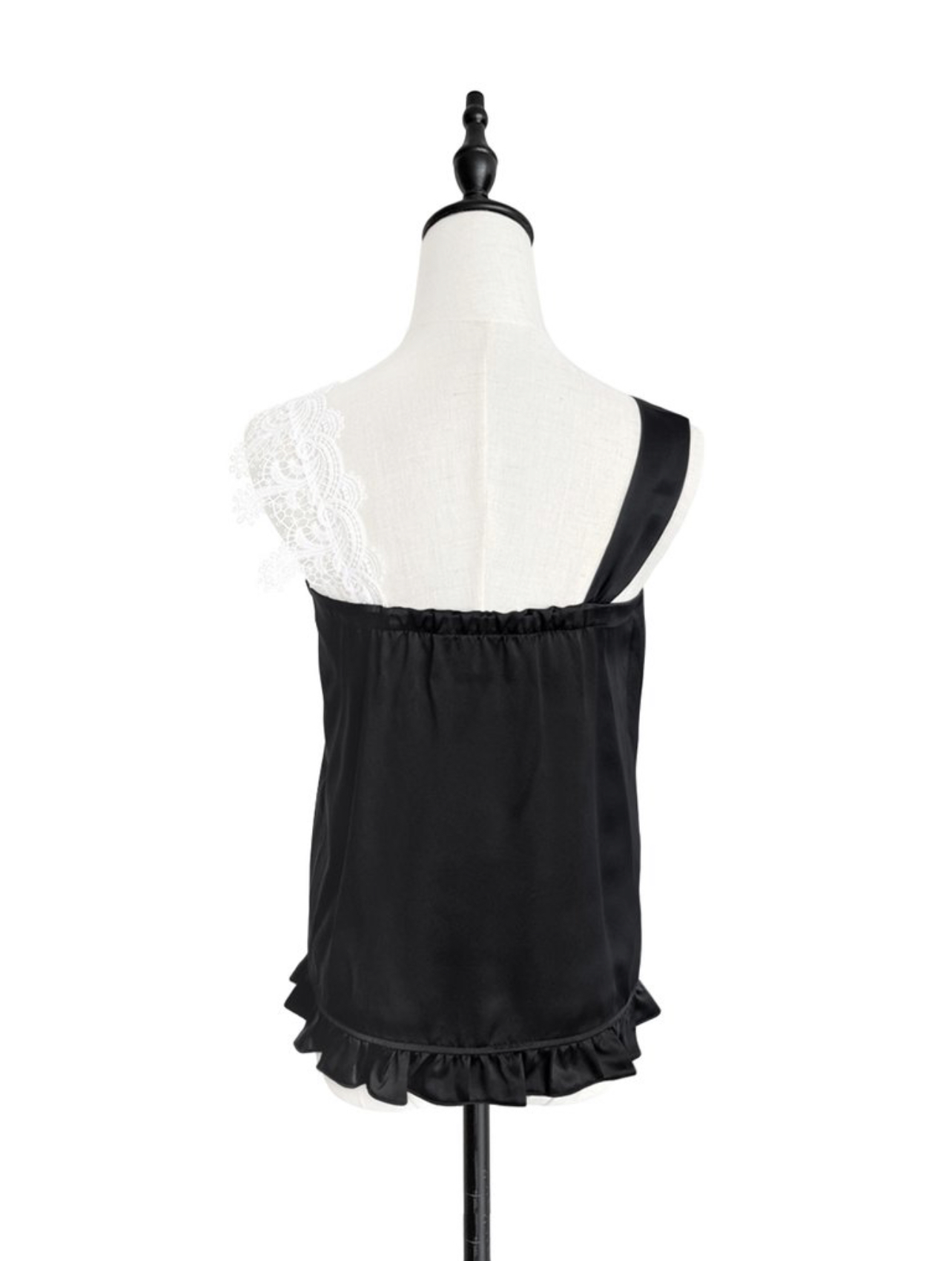 TYNVIE 不对称蕾丝肩带真丝背心 - 黑色