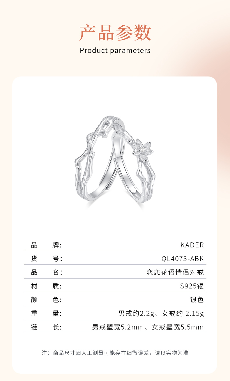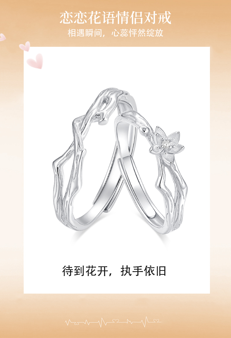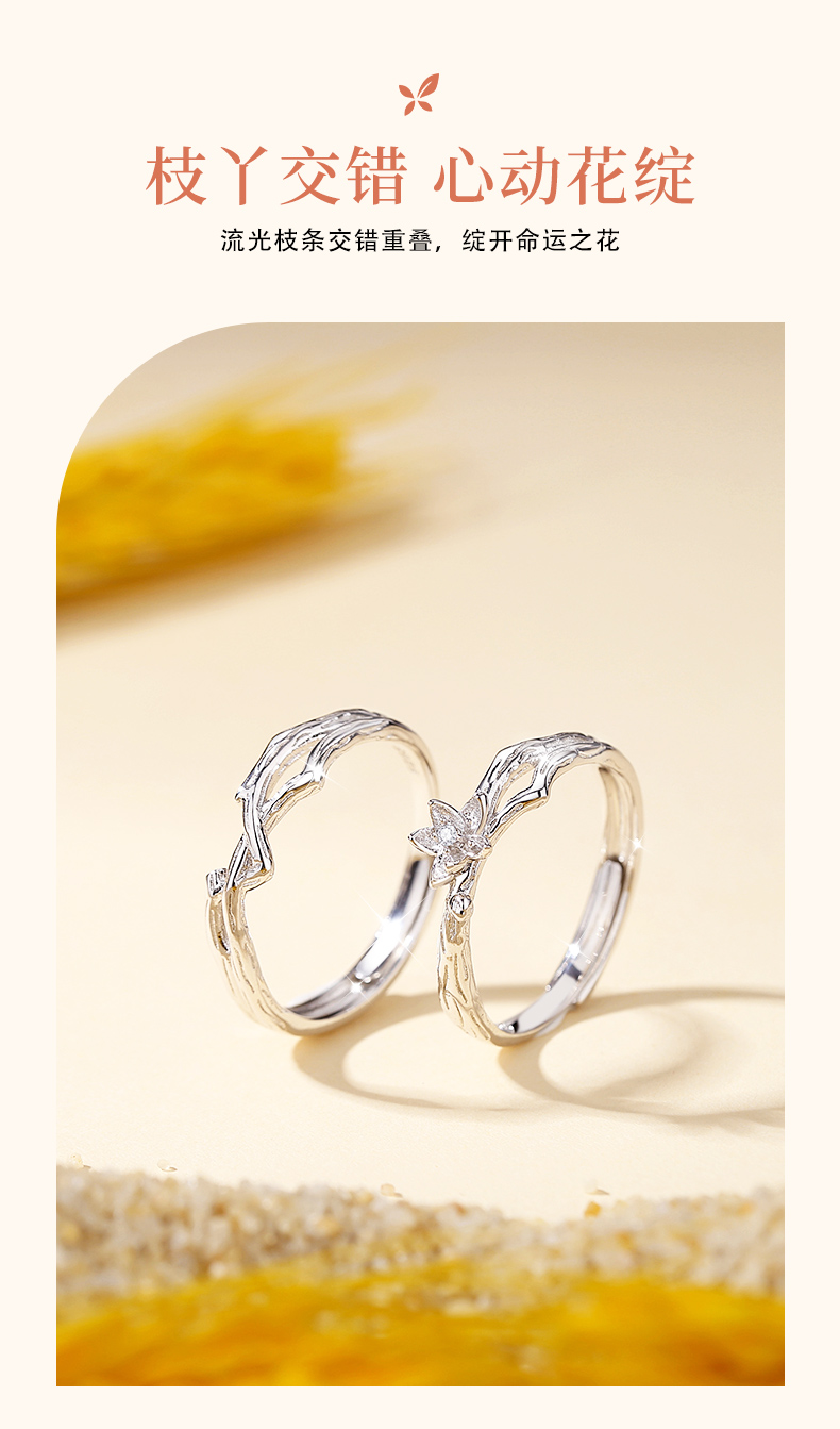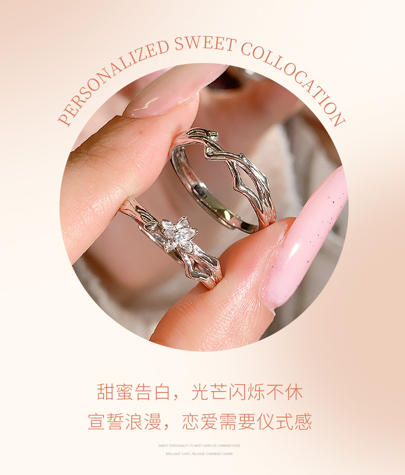 卡蒂罗KADER 恋恋花语情侣对戒 925银温柔简约浪漫连理枝甜蜜轻奢小众不规则素圈开口可调节一对 百搭时尚钟爱久久